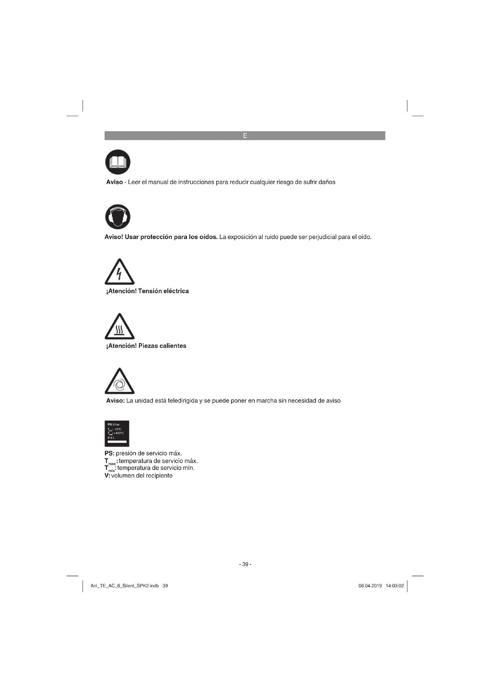 ¡Atención! Tensión eléctrica ¡Atención! Piezas calientes Aviso: La unidad está teledirigida y se puede poner en marcha sin necesidad de aviso Aviso! Usar protección para los oídos. La exposición al ruido puede ser perjudicial para el oído. Aviso - Leer el manual de instrucciones para reducir cualquier riesgo de sufrir daños PS: presión de servicio máx.