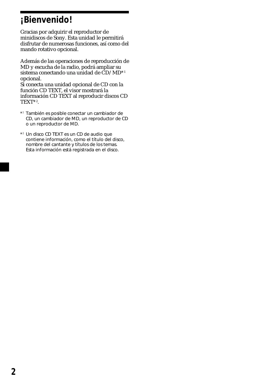 Gracias por adquirir el reproductor de minidiscos de Sony. Esta unidad le permitirá disfrutar de numerosas funciones, así como del mando rotativo opcional. Además de las operaciones de reproducción de MD y escucha de la radio, podrá ampliar su sistema conectando una unidad de CD/MD*1 opcional. Si conecta una unidad opcional de CD con la función CD TEXT, el visor mostrará la información CD TEXT al reproducir discos CD TEXT*2. *1 También es posible conectar un cambiador de CD, un cambiador de MD, un reproductor de CD o un reproductor de MD. *2 Un disco CD TEXT es un CD de audio que contiene información, como el título del disco, nombre del cantante y títulos de los temas. Esta información está registrada en el disco.