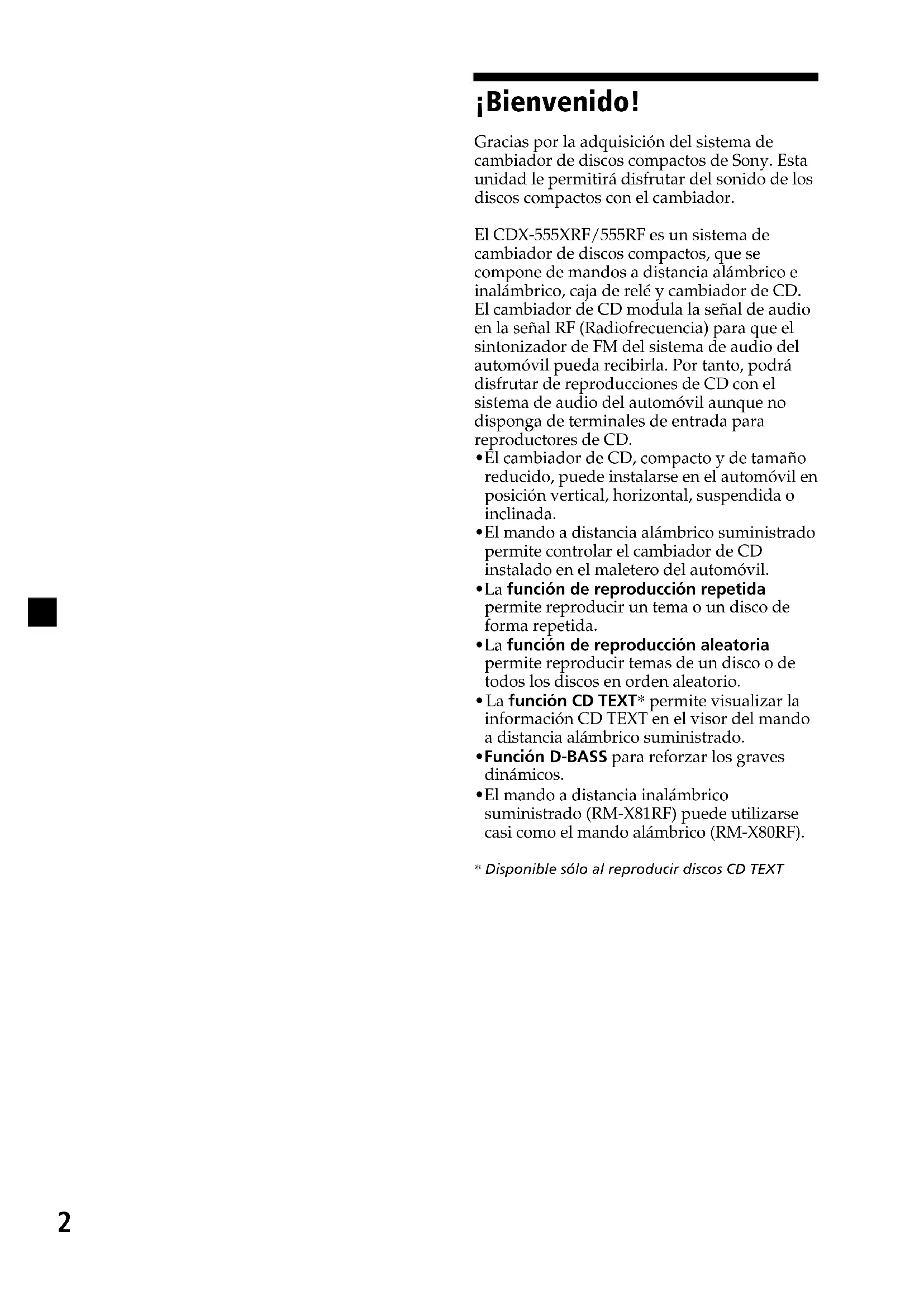 - Le disque est sale ou défectueux. t Nettoyez ou remplacez-le. Retirez le chargeur, appuyez sur Z et réintroduisez le chargeur jusqu’à ce qu’il s’encliquette correctement en position. Problème L’appareil ne fonctionne pas. Le son saute. Le chargeur de disques est mal encastré.2 ¡Bienvenido! Gracias por la adquisición del sistema de cambiador de discos compactos de Sony. Esta unidad le permitirá disfrutar del sonido de los discos compactos con el cambiador. El CDX-555XRF/555RF es un sistema de cambiador de discos compactos, que se compone de mandos a distancia alámbrico e inalámbrico, caja de relé y cambiador de CD. El cambiador de CD modula la señal de audio en la señal RF (Radiofrecuencia) para que el sintonizador de FM del sistema de audio del automóvil pueda recibirla. Por tanto, podrá disfrutar de reproducciones de CD con el sistema de audio del automóvil aunque no disponga de terminales de entrada para reproductores de CD.