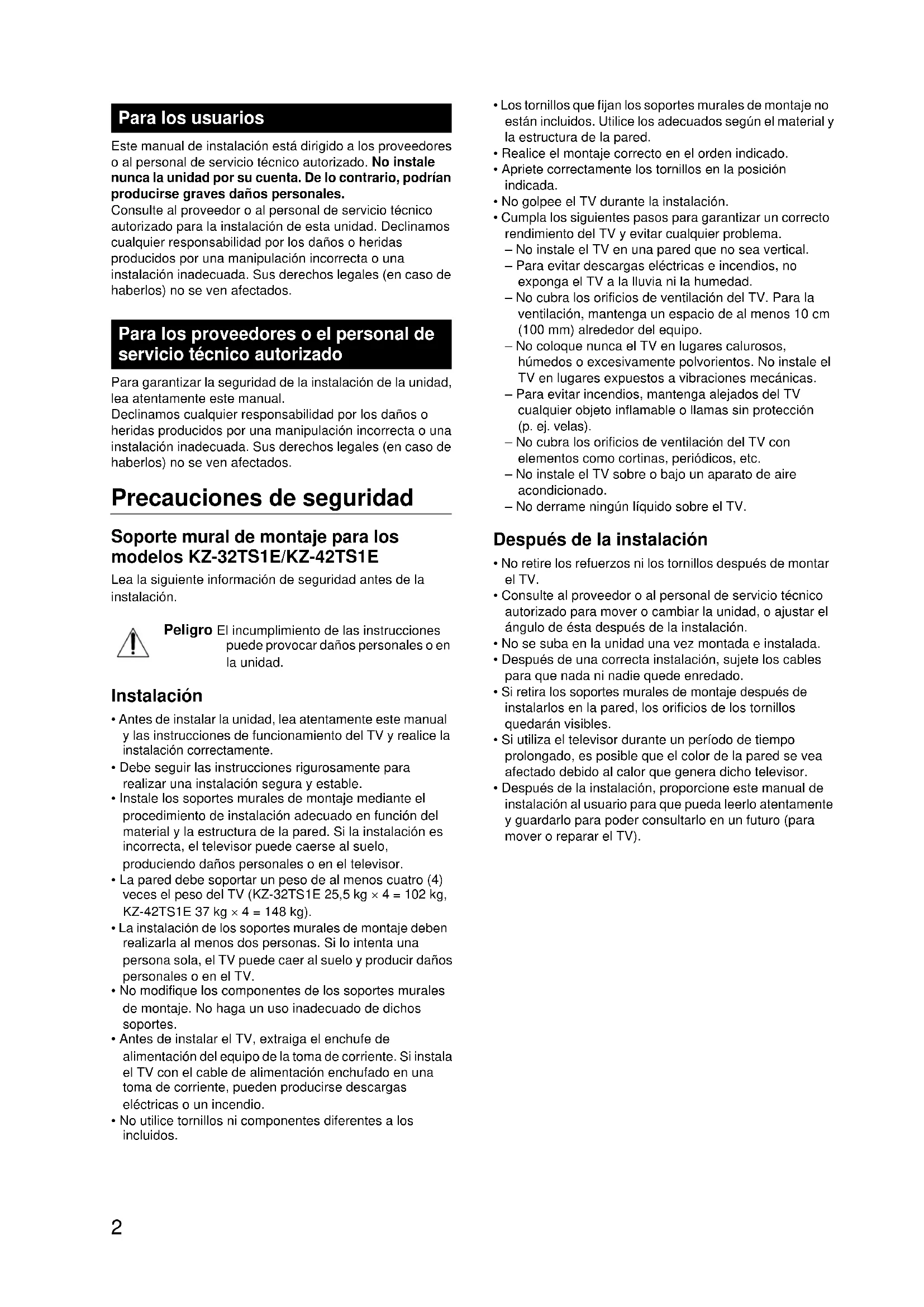 - La pared debe soportar un peso de al menos cinco (4) vezes el peso del TV (KZ-32TS1E 25,5 kg × 4 = 102 kg, KZ-42TS1E 37 kg × 4 = 148 kg).
