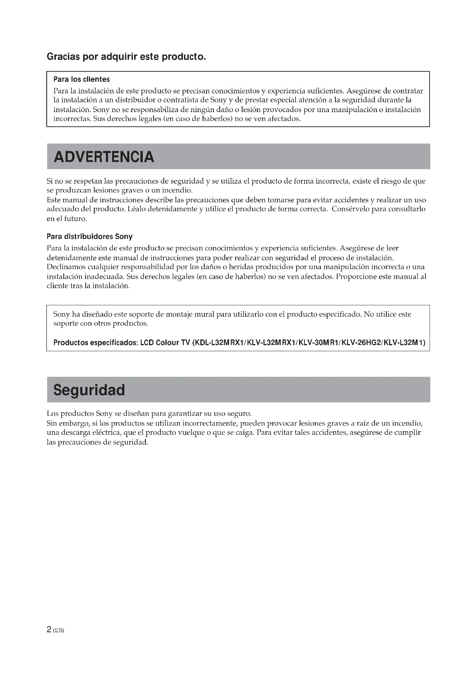 2452 (ES) Gracias por adquirir este producto. Para los clientes Para la instalación de este producto se precisan conocimientos y experiencia suficientes. Asegúrese de contratar la instalación a un distribuidor o contratista de Sony y de prestar especial atención a la seguridad durante la instalación. Sony no se responsabiliza de ningún daño o lesión provocados por una manipulación o instalación incorrectas. Sus derechos legales (en caso de haberlos) no se ven afectados. ADVERTENCIA Si no se respetan las precauciones de seguridad y se utiliza el producto de forma incorrecta, existe el riesgo de que se produzcan lesiones graves o un incendio. Este manual de instrucciones describe las precauciones que deben tomarse para evitar accidentes y realizar un uso adecuado del producto. Léalo detenidamente y utilice el producto de forma correcta. Consérvelo para consultarlo en el futuro. Para distribuidores Sony Para la instalación de este producto se precisan conocimientos y experiencia suficientes. Asegúrese de leer detenidamente este manual de instrucciones para poder realizar con seguridad el proceso de instalación. Declinamos cualquier responsabilidad por los daños o heridas producidos por una manipulación incorrecta o una instalación inadecuada. Sus derechos legales (en caso de haberlos) no se ven afectados. Proporcione este manual al cliente tras la instalación. Sony ha diseñado este soporte de montaje mural para utilizarlo con el producto especificado. No utilice este soporte con otros productos. Productos especificados: LCD Colour TV (KDL-L32MRX1/KLV-L32MRX1/KLV-30MR1/KLV-26HG2/KLV-L32M1) Seguridad Los productos Sony se diseñan para garantizar su uso seguro. Sin embargo, si los productos se utilizan incorrectamente, pueden provocar lesiones graves a raíz de un incendio, una descarga eléctrica, que el producto vuelque o que se caiga. Para evitar tales accidentes, asegúrese de cumplir las precauciones de seguridad.3 (ES) Español