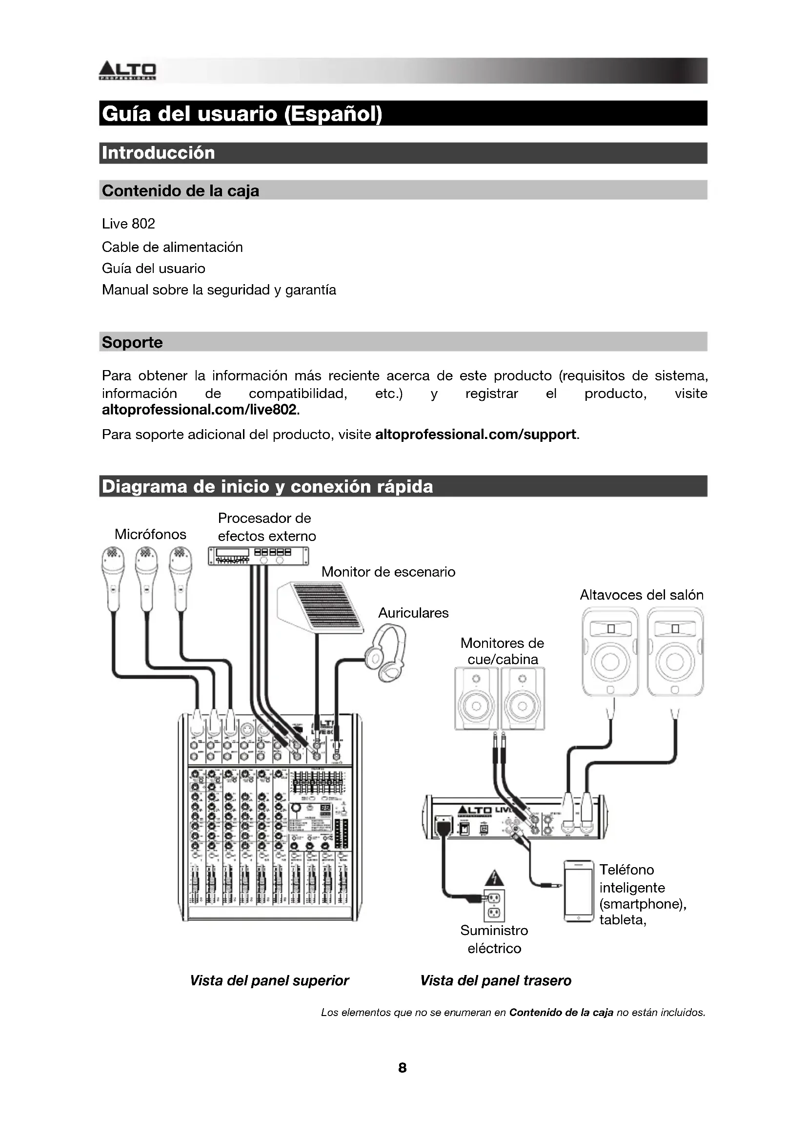 Soporte Para obtener la información más reciente acerca de este producto (requisitos de sistema, información de compatibilidad, etc.) y registrar el producto, visite altoprofessional.com/live802. Para soporte adicional del producto, visite altoprofessional.com/support.