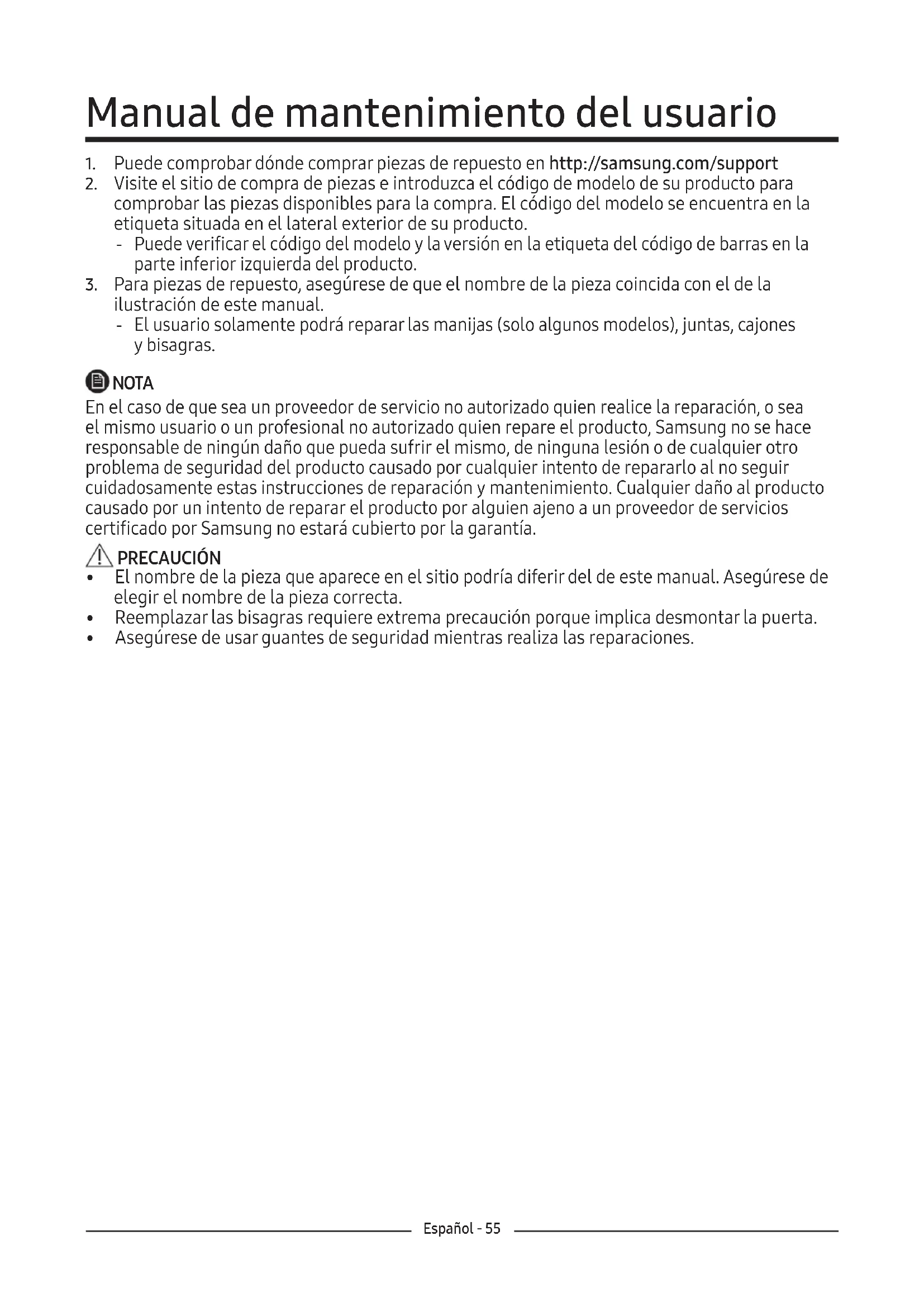 ilustración de este manual. ‐ El usuario solamente podrá reparar las manijas (solo algunos modelos), juntas, cajones ybisagras. NOTA En el caso de que sea un proveedor de servicio no autorizado quien realice la reparación, o sea el mismo usuario o un profesional no autorizado quien repare el producto, Samsung no se hace responsable de ningún daño que pueda sufrir el mismo, de ninguna lesión o de cualquier otro problema de seguridad del producto causado por cualquier intento de repararlo al no seguir cuidadosamente estas instrucciones de reparación y mantenimiento. Cualquier daño al producto causado por un intento de reparar el producto por alguien ajeno a un proveedor de servicios certificado por Samsung no estará cubierto por la garantía. PRECAUCIÓN