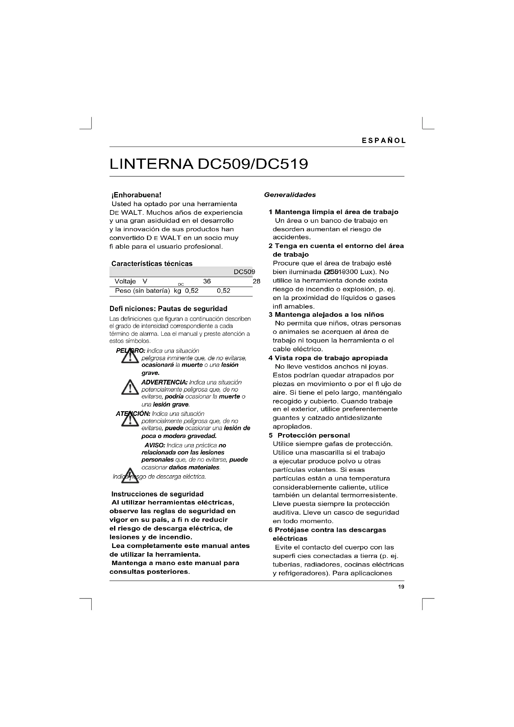 - Tómese el tiempo necesario para leer y comprender este manual antes de utilizar la herramienta. Descripción (fi g. A) ADVERTENCIA: Jamás altere la linterna ni ninguna de sus piezas. Podrían producirse lesiones personales o daños. Uso Previsto Las linternas para trabajos pesados DC509/DC519 han sido diseñadas para funcionar con baterías de 36 V o 28 V y pueden utilizarse como modelo de mano o independiente. NO use la herramienta bajo condiciones de humedad o en presencia de gases o líquidos infl amables. NO permita que los niños tengan contacto con la herramienta. Cuando la hagan funcionar operarios sin experiencia, es necesa-ria su supervisión. 1 Interruptor de marcha/parada 2 Base 3 Tubo fl exible 4 Cabezal 5 Lente 6 Portalente 7 Batería (no incluido) Seguridad eléctrica Compruebe siempre que la potencia de la batería corresponda al valor indicado en la placa de características. Asegúrese también de que la tensión de su cargador corresponda a la tensión de la red.