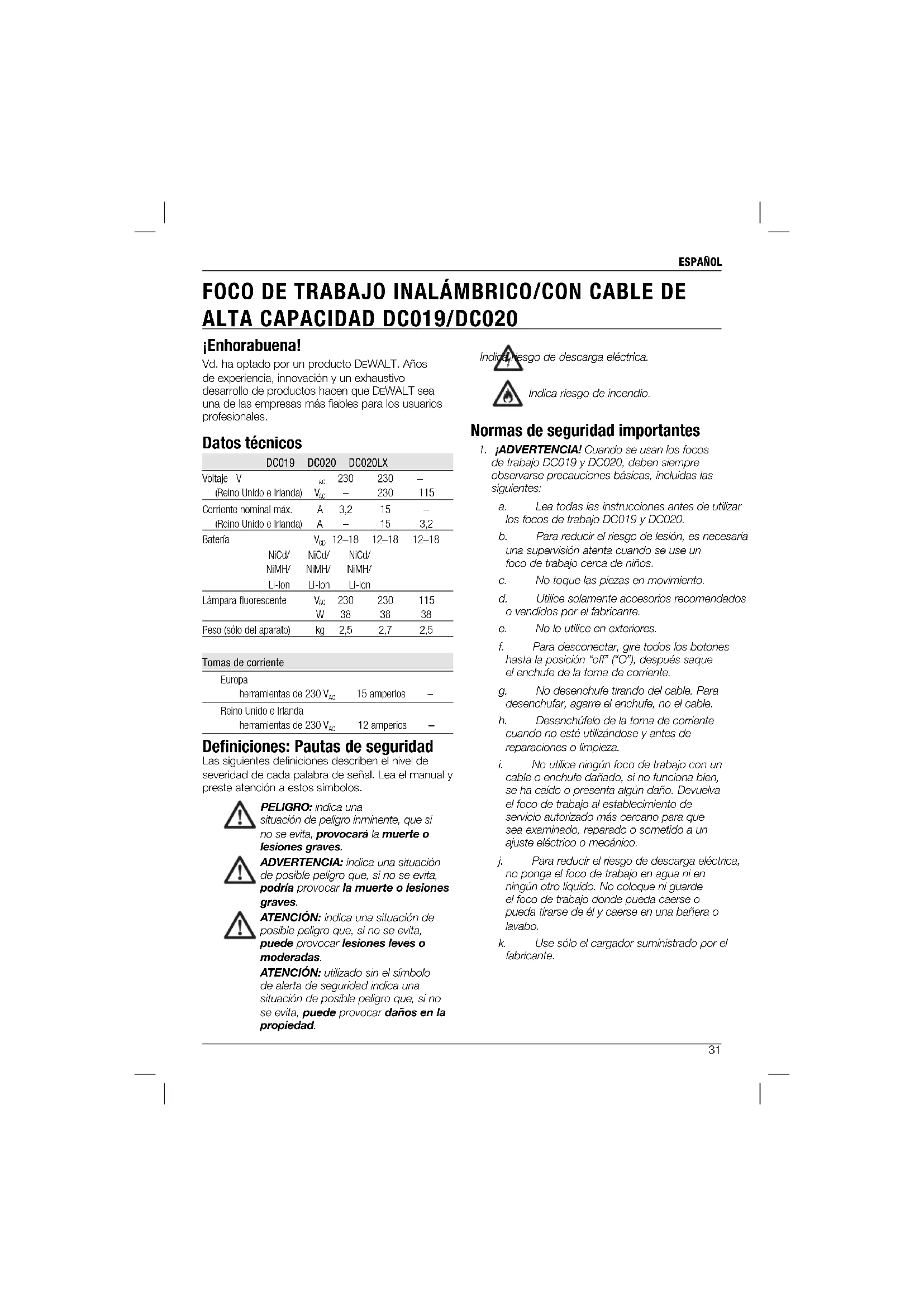 cable o enchufe dañado, si no funciona bien, se ha caído o presenta algún daño. Devuelva el foco de trabajo al establecimiento de servicio autorizado más cercano para que sea examinado, reparado o sometido a un ajuste eléctrico o mecánico. j. Para reducir el riesgo de descarga eléctrica, no ponga el foco de trabajo en agua ni en ningún otro líquido. No coloque ni guarde el foco de trabajo donde pueda caerse o pueda tirarse de él y caerse en una bañera o lavabo. k. Use sólo el cargador suministrado por el fabricante. ¡Enhorabuena! Vd. ha optado por un producto DEWALT. Años de experiencia, innovación y un exhaustivo desarrollo de productos hacen que D EWALT sea una de las empresas más fiables para los usuarios profesionales. Datos técnicos DC019 DC020 DC020LX Voltaje V