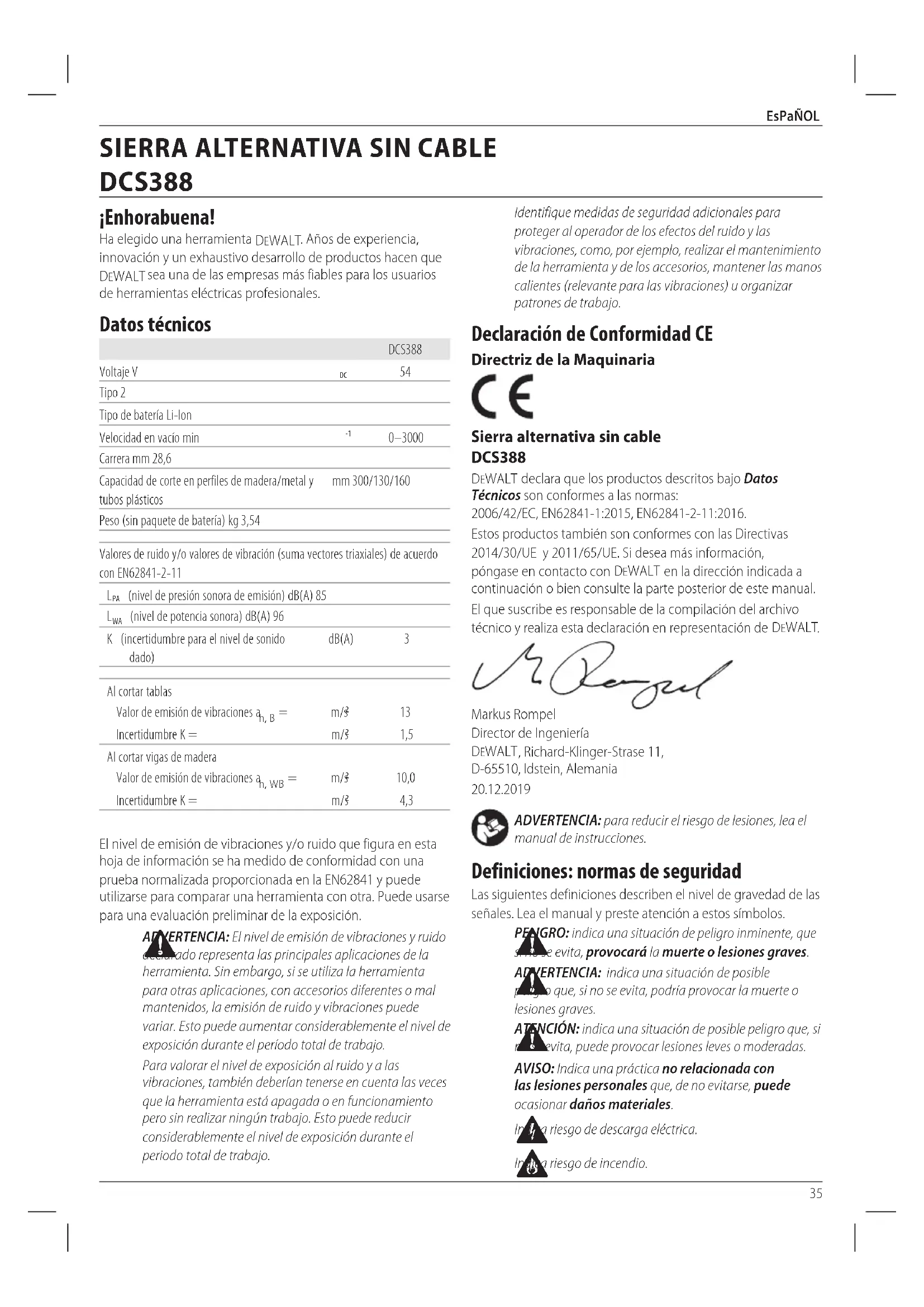 Indica riesgo deincendio. Declaración de Conformidad CE Directriz de la Maquinaria Sierra alternativa sin cable DCS388 DeWALT declara que los productos descritos bajo Datos Técnicos son conformes a las normas: 2006/42/EC, EN62841-1:2015, EN62841-2-11:2016. Estos productos también son conformes con las Directivas 2014/30/UE y 2011/65/UE. Si desea más información, póngase en contacto con DeWALT en la dirección indicada a continuación o bien consulte la parte posterior de estemanual. El que suscribe es responsable de la compilación del archivo técnico y realiza esta declaración en representación de DeWALT