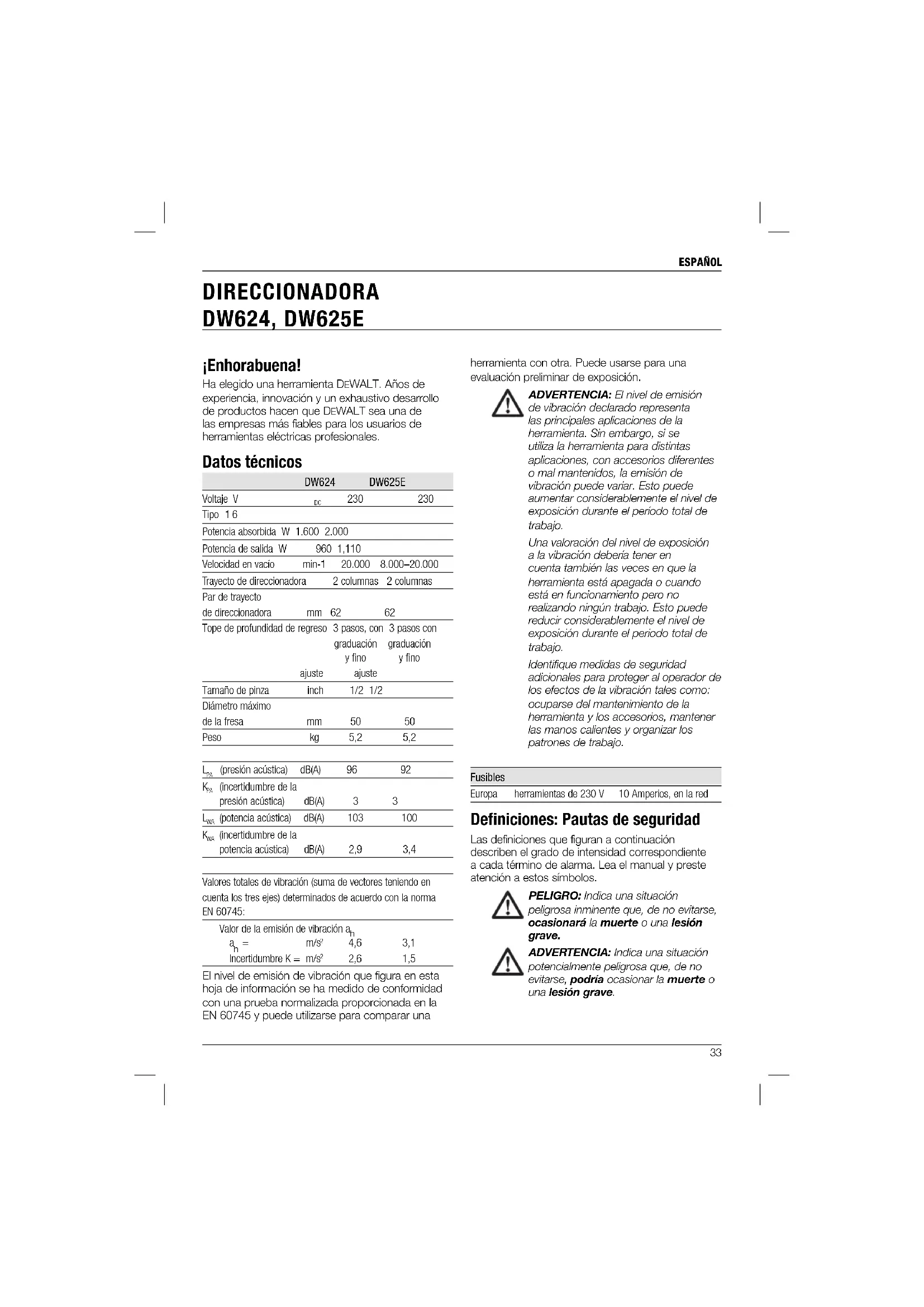 DIRECCIONADORA DW624, DW625E ¡Enhorabuena! Ha elegido una herramienta DEWALT. Años de experiencia, innovación y un exhaustivo desarrollo de productos hacen que DEWALT sea una de las empresas más fiables para los usuarios de herramientas eléctricas profesionales. Datos técnicos DW624 DW625E Voltaje V