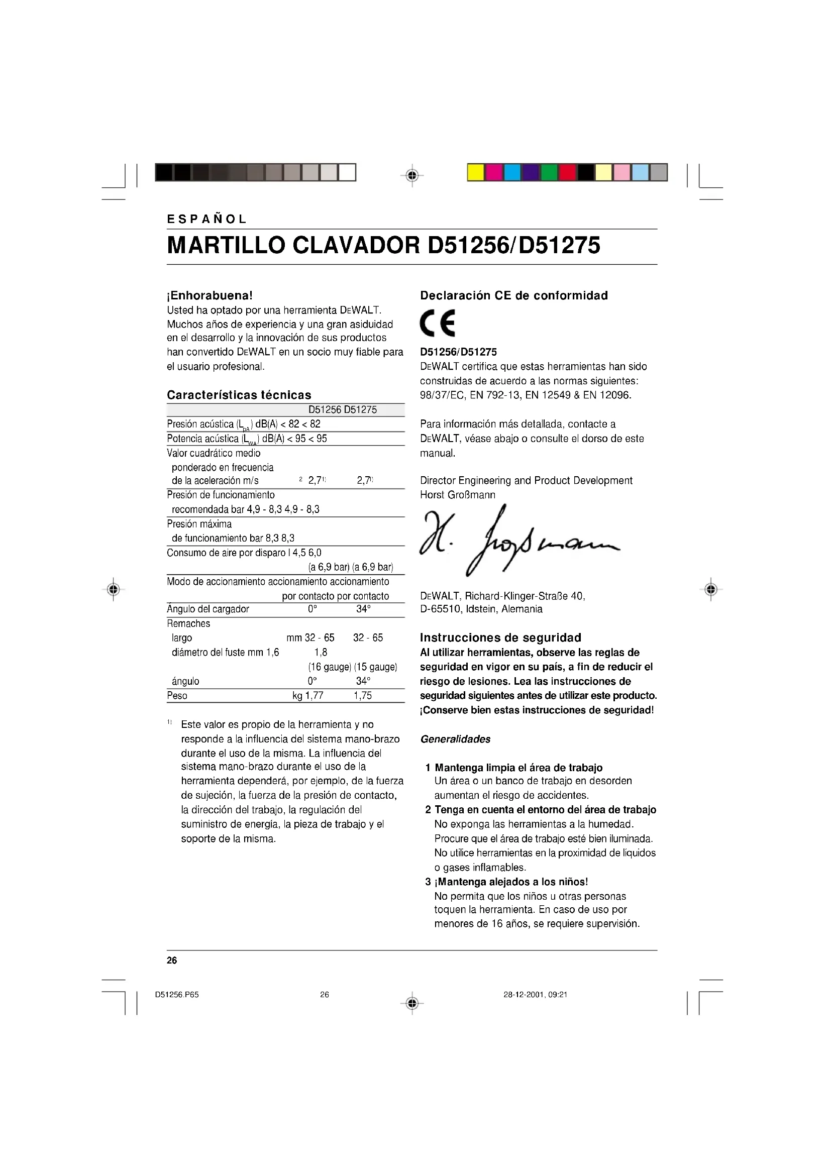 Este valor es propio de la herramienta y no responde a la influencia del sistema mano-brazo durante el uso de la misma. La influencia del sistema mano-brazo durante el uso de la herramienta dependerá, por ejemplo, de la fuerza de sujeción, la fuerza de la presión de contacto, la dirección del trabajo, la regulación del suministro de energía, la pieza de trabajo y el soporte de la misma. Declaración CE de conformidad D51256/D51275 DEWALT certifica que estas herramientas han sido construidas de acuerdo a las normas siguientes: 98/37/EC, EN 792-13, EN 12549 & EN 12096. Para información más detallada, contacte a DEWALT, véase abajo o consulte el dorso de este manual. Director Engineering and Product Development Horst Großmann DEWALT, Richard-Klinger-Straße 40, D-65510, Idstein, Alemania Instrucciones de seguridad Al utilizar herramientas, observe las reglas de seguridad en vigor en su país, a fin de reducir el riesgo de lesiones. Lea las instrucciones de seguridad siguientes antes de utilizar este producto. ¡Conserve bien estas instrucciones de seguridad! Generalidades 1 Mantenga limpia el área de trabajo Un área o un banco de trabajo en desorden aumentan el riesgo de accidentes. 2 Tenga en cuenta el entorno del área de trabajo No exponga las herramientas a la humedad. Procure que el área de trabajo esté bien iluminada. No utilice herramientas en la proximidad de líquidos o gases inflamables. 3 ¡Mantenga alejados a los niños! No permita que los niños u otras personas toquen la herramienta. En caso de uso por menores de 16 años, se requiere supervisión. D51256.P65 28-12-2001, 09:212627 ESPAÑOL 4 Guarde las herramientas que no utiliza Las herramientas que no se utilizan, deben estar guardadas en un lugar seco, cerrado y fuera del alcance de los niños. 5 Vista ropa de trabajo apropiada No lleve vestidos anchos ni joyas. Estos podrían ser atrapados por piezas en movimiento. Para trabajos al exterior, se recomienda llevar guantes de goma y calzado de suela antideslizante. Si tiene el pelo largo, téngalo recogido y cubierto. 6 No alargue demasiado su radio de acción Mantenga un apoyo firme sobre el suelo y conserve el equilibrio en todo momento. 7 Esté siempre alerta Mire lo que está haciendo. Use el sentido común. No maneje la herramienta cuando está cansado. 8 Utilice la herramienta adecuada En este manual, se indica para qué uso está destinada la herramienta. No utilice herramientas o dispositivos acoplables de potencia demasiado débil para ejecutar trabajos pesados. La herramienta funcionará mejor y con mayor seguridad al ser utilizada de acuerdo con sus características técnicas. ¡ATENCION! El uso de accesorios o acoplamientos, o el uso de la herramienta misma distintos de los recomendados en este manual de instrucciones, puede dar lugar a lesiones de personas. 9 Mantenga las herramientas asiduamente Mantenga sus herramientas afiladas y limpias para trabajar mejor y más seguro. Siga las instrucciones para el mantenimiento y la sustitución de accesorios. Mantenga todos los mandos secos, limpios y libres de aceite y grasa. 10 Comprobar que no haya partes averiadas Antes de utilizar la herramienta, compruebea que no haya averías, a fin de asegurar que funcionará correctamente y sin problemas. Compruebe que no haya desalineamiento o enganchamiento de piezas en movimiento, ni roturas de piezas, ni accesorios mal montados, ni cualquier otro defecto que pudiera perjudicar al buen funcionamiento de la herramienta. Haga reparar o sustituir los dispositivos de seguridad u otros componentes defectuosos según las instrucciones. 11 Haga reparar su herramienta en un Centro de Servicio DEWALT Esta herramienta cumple con las reglas de seguridad en vigor. Para evitar situaciones peligrosas, la reparación de herramientas debe ser efectuada únicamente por un técnico competente. Instrucciones de seguridad adicionales para martillos clavadores neumáticos