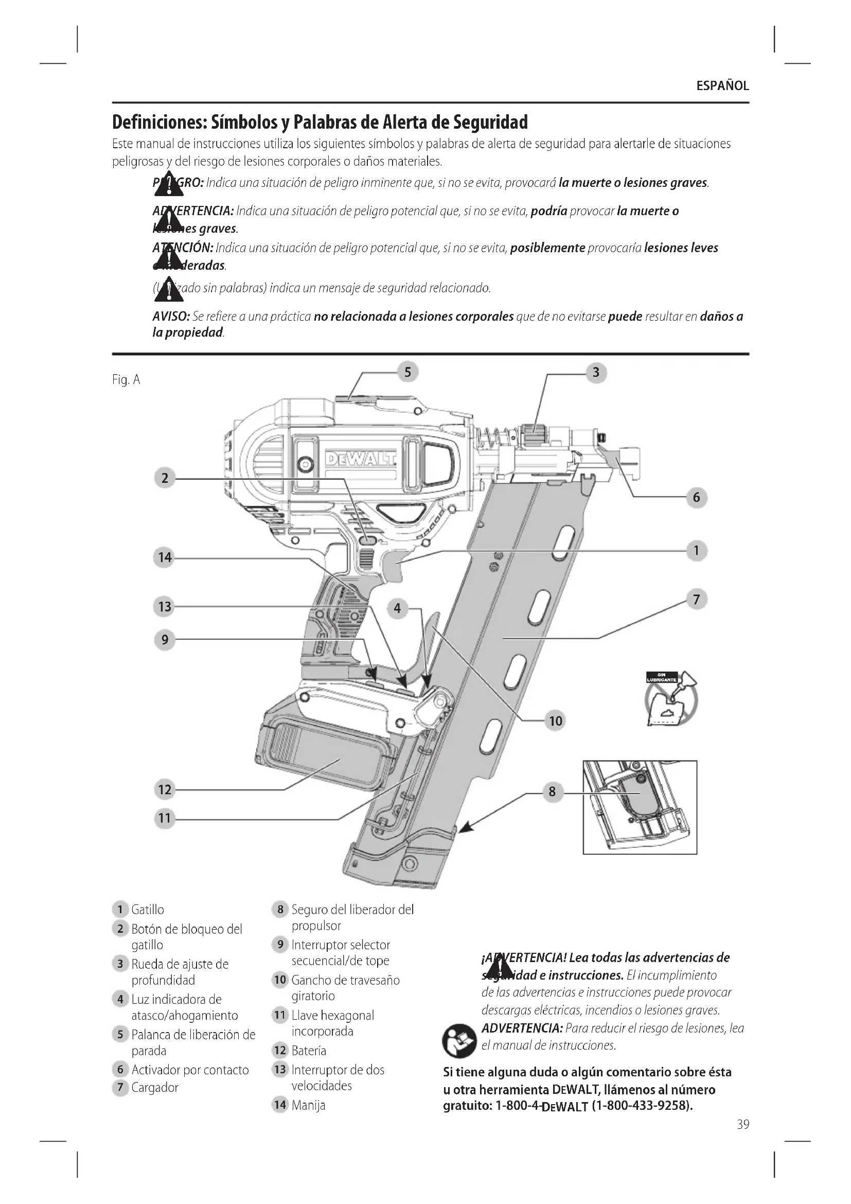 ¡ADVERTENCIA! Lea todas las advertencias de seguridad e instrucciones. El incumplimiento de las advertencias e instrucciones puede provocar descargas eléctricas, incendios o lesionesgraves. ADVERTENCIA: Para reducir el riesgo de lesiones, lea el manual deinstrucciones. Si tiene alguna duda o algún comentario sobre ésta u otra herramienta DeWALT , llámenos al número gratuito: 1-800-4- DeWALT (1-800-433-9258).
