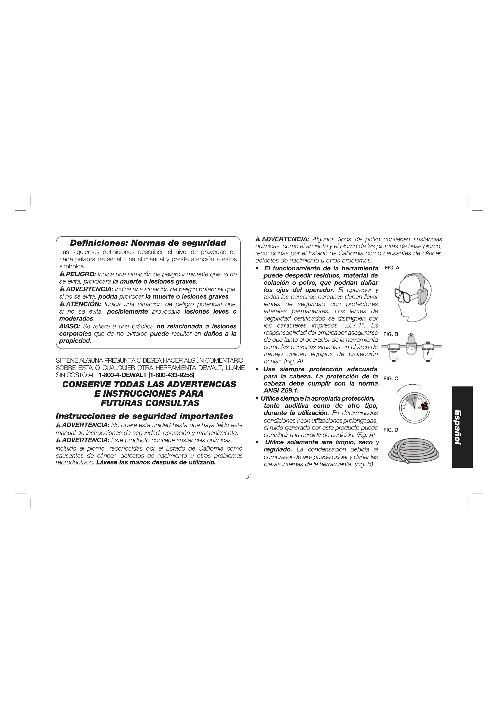 - Utilice siempre la apropiada protección, tanto auditiva como de otro tipo, durante la utilización. En determinadas condiciones y con utilizaciones prolongadas, el ruido generado por este producto puede contribuir a la pérdida de audición. (Fig. A)