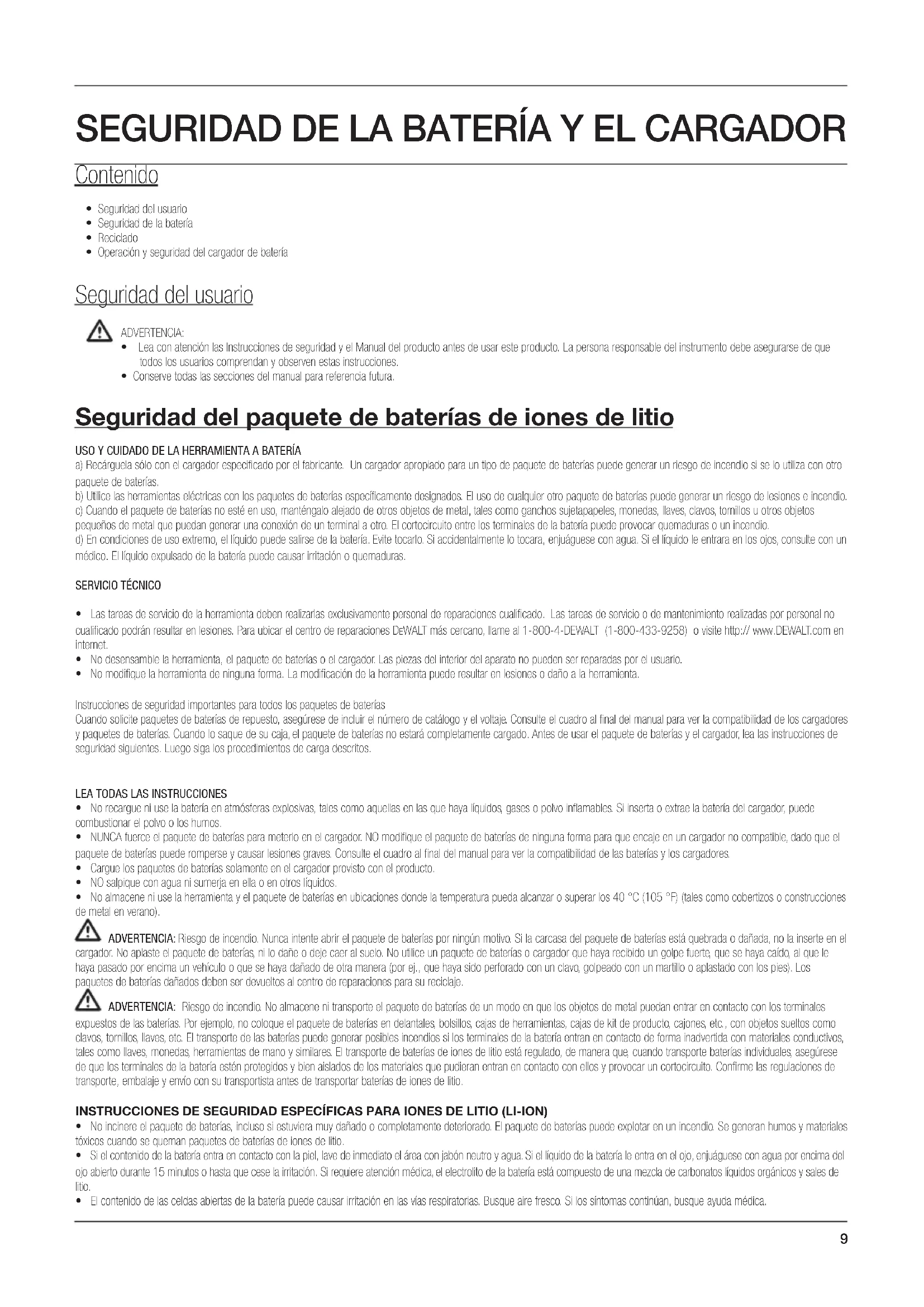 - El contenido de las celdas abiertas de la batería puede causar irritación en las vías respiratorias. Busque aire fresco. Si los síntomas continúan, busque ayuda médica. SEGURIDAD DE LA BATERÍA Y EL CARGADOR10 ADVERTENCIA: Riesgo de quemadura. El líquido de la batería puede ser inflamable si se lo expone a una chispa o llama. Reciclado El sello RBRC™ El sello RBRC™ (Compañía de reciclado de baterías recargables) en las baterías (o paquetes de baterías) de níquel cadmio, hidruro de metal de níquel o iones de litio indica que los gastos de reciclaje de estas baterías (o paquetes de baterías) que se deben afrontar al final de su vida útil ya han sido pagados por DEWALT. En algunas áreas, es ilegal colocar baterías gastadas de níquel cadmio, hidruro de metal de níquel o iones de litio en la basura o el circuito de desechos sólidos municipales, y el programa de la RBRC ofrece una alternativa respetuosa con el medioambiente. RBRC™, en cooperación con DEWALT y otros usuarios de baterías, ha establecido programas en los Estados Unidos y Canadá para facilitar la recolección de baterías gastadas de níquel cadmio, hidruro de metal de níquel o iones de litio. Ayude a proteger nuestro medioambiente y preservar los recursos naturales llevando dichas baterías a un centro de reparaciones DEWALT autorizado o a su vendedor minorista local para que las reciclen. También puede contactar a su centro de reciclaje local para obtener información sobre el lugar de recolección de baterías gastadas. RBRC™ es una marca comercial registrada de la compañía Rechargeable Battery Recycling Corporation. Seguridad del cargador de baterías Instrucciones de seguridad importantes para todos los cargadores de baterías Cargadores CONSERVE ESTAS INSTRUCCIONES: Este manual contiene importantes instrucciones de funcionamiento y seguridad para cargadores de baterías. Su herramienta utiliza un cargador DEWALT. Consulte el cuadro en la contratapa de este manual para ver la compatibilidad de cargadores y paquetes de baterías.