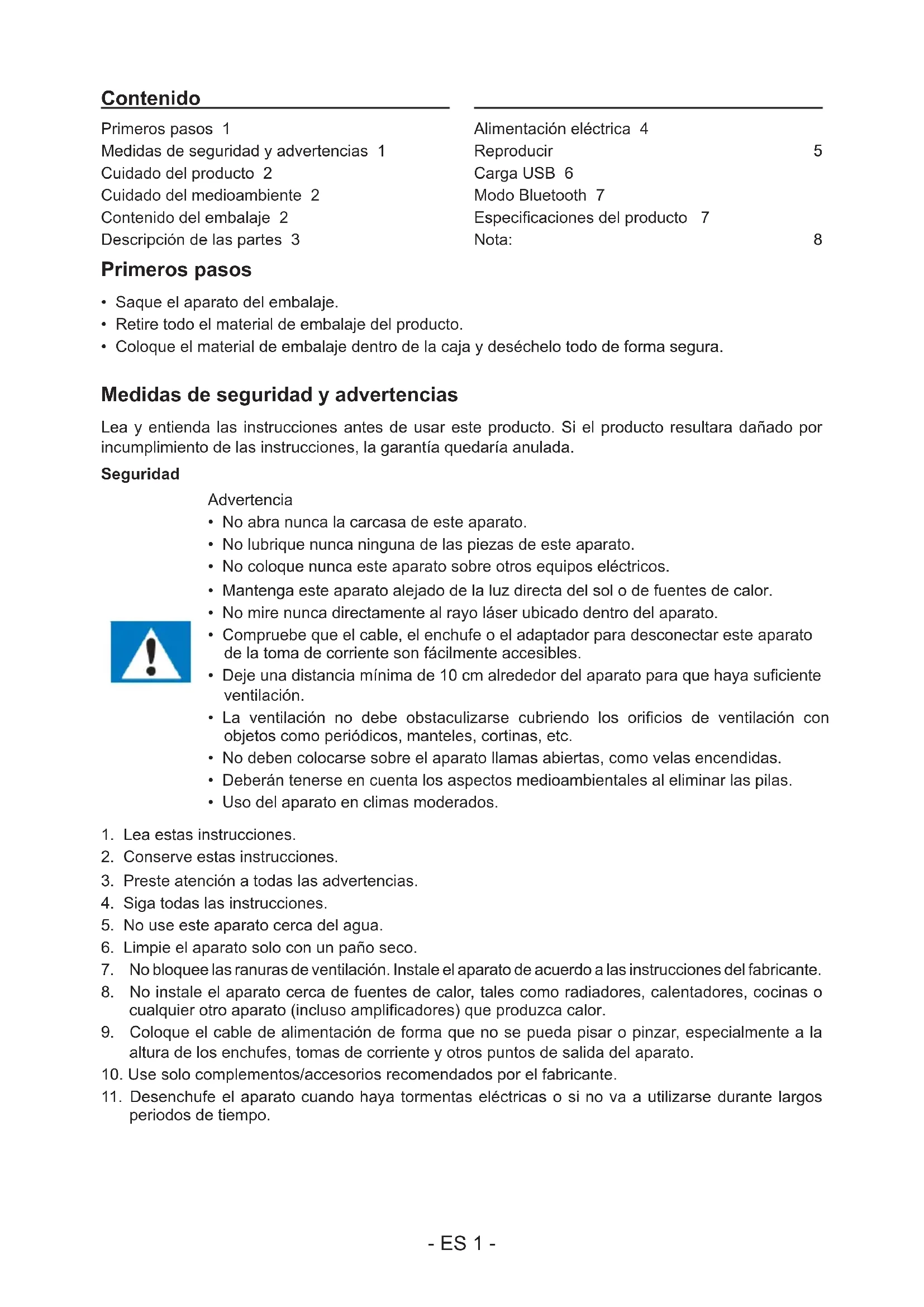 periodos de tiempo. Primeros pasos 1 Medidas de seguridad y advertencias 1 Cuidado del producto 2 Cuidado del medioambiente 2 Contenido del embalaje 2 Descripción de las partes 3 Alimentación eléctrica 4 Reproducir 5 Carga USB 6 Modo Bluetooth 7 Especicaciones del producto 7 Nota: 8 Contenido- ES 2 -