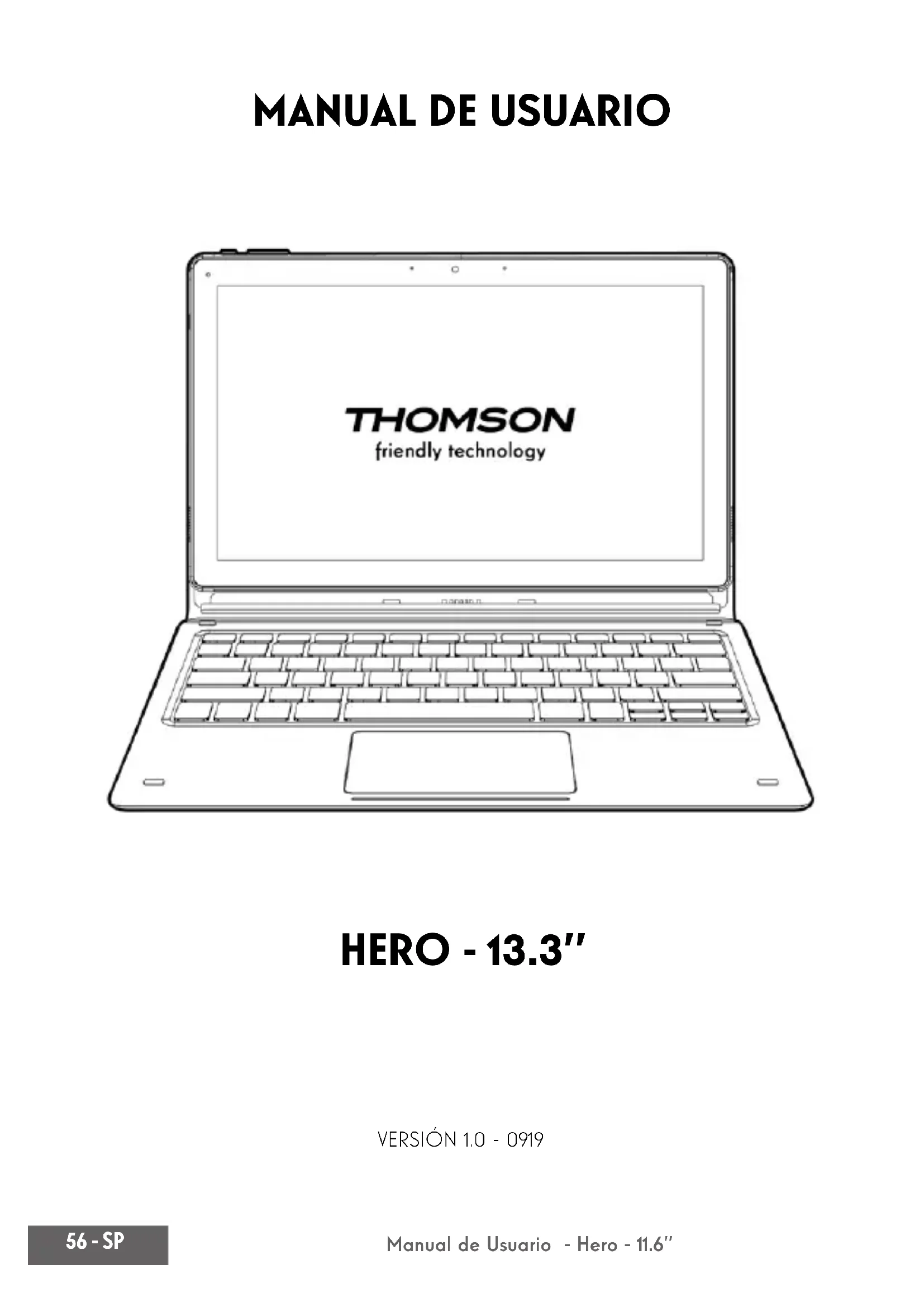 mythomson.com Aviso legal Marca comercial THOMSON y el logotipo de THOMSON son marcas registradas de Technicolor (S.A.) o de sus liales y son utilizadas bajo licencia por el Grupo SFIT. Microsoft®, Windows®, Windows Server® y Windows Vista® son marcas registradas de Microsoft Corporation en los Estados Unidos y/o en otros países/regiones. Los nombres de software en esta Guía del usuario son propiedad de sus respectivas compañías de acuerdo con el acuerdo de licencia correspondiente. Cualquier referencia a este software se da sólo a título informativo. Todos los demás nombres de productos y marcas mencionados aquí pueden ser marcas registradas, marcas comerciales o marcas de servicio de sus respectivos propietarios. Cualquier referencia a estos nombres es sólo a título informativo. Derechos de autor Está prohibido copiar, traducir, modicar o transmitir esta Guía de usuario por cualquier medio o en cualquier formato sin el consentimiento previo por escrito de Group SFIT (SAS). Extención de responsabilidad Para una mejor experiencia del usuario, Group SFIT (SAS) se reserva el derecho de hacer cambios en este Manual de usuario. La información contenida en este documento está sujeta a cambios sin previo aviso. Los usuarios son responsables de cualquier daño que resulte del uso inadecuado de esta Guía de usuario. Además, a excepción de la garantía explícita dada en el manual de mantenimiento del producto o en nuestro compromiso de servicio, Group SFIT (SAS) no ofrece ninguna garantía, expresa o implícita, relacionada con esta Guía de usuario (incluyendo las formulaciones elegidas). Declaración de conformidad El Grupo SFIT declara por la presente que este producto cumple con los requisitos esenciales y otras disposiciones aplicables de la Directiva 2015/53/UE. La declaración de conformidad esta disponible en el enlace de Internet: www.mythomson.com58 - SP Manual de Usuario - Hero - 11.6’’ mythomson.com - Instrucciones importantes de seguridad - Esta unidad debe usarse en un ambiente con una temperatura ambiente entre 5°C (41°F) y 35°C (95°F). No exponga la unidad a la lluvia o la humedad y manténgala alejada de los líquidos. En caso de salpicaduras de agua u otro líquido sobre la unidad, apáguela inmediatamente y espere a que esté completamente seca antes de volver a encenderla. No exponga el aparato directamente a la radiación solar. No utilice disolventes fuertes, detergentes líquidos u otros productos químicos sobre o cerca de la supercie de la unidad para evitar la corrosión o el deterioro de la supercie de la unidad. No exponga la cámara a un entorno polvoriento. No utilice la unidad durante una fuga de gas. No exponga el dispositivo a campos magnéticos o eléctricos fuertes. Puede pasar el dispositivo por los detectores de rayos X del aeropuerto. Sin embargo, se recomienda no pasar el dispositivo por los portales de detección magnética ni exponerlo a detectores portátiles. No coloque ningún objeto sobre el dispositivo. No coloque la unidad sobre una supercie irregular o inestable. Asegúrese de proteger la unidad contra caídas o cualquier otro impacto que pueda dañarla. No deje el aparato puesto o cargado en su regazo o en cualquier otra parte de su cuerpo para evitar cualquier riesgo de lesiones relacionadas con el calor. Apague la unidad antes de transportarla o de cubrirla con un material que no permita una circulación óptima de aire. No utilice cables de alimentación, accesorios u otros dispositivos dañados con su dispositivo. Recomendamos el uso exclusivo de los accesorios (fuente de alimentación, cables, etc.) suministrados con la unidad.SP - 59 mythomson.com Utilice únicamente baterías originales. La sustitución de la batería por una batería incorrecta puede causar un riesgo de explosión. No desmonte, modique o repare la unidad usted mismo, ya que esto puede anular la garantía. Por favor, haga copias de seguridad de su contenido importante con regularidad para evitar la pérdida de datos. Nuestra empresa no se hace responsable de la pérdida o eliminación de los elementos contenidos en el dispositivo debido al uso inadecuado del hardware o software, a la falta de mantenimiento o a cualquier otro evento accidental. A plena potencia, prolongada escuchar el reproductor de música puede dañar el oído del usuario. Este producto ha sido diseñado para permitir el reciclaje adecuado de piezas y componentes. El símbolo que representa un contenedor de basura tachado indica que el dispositivo no debe desecharse con residuos municipales. Consulte la normativa local para la eliminación de aparatos electrónicos. El símbolo que representa un contenedor de basura tachado indica que la batería no debe desecharse con los residuos municipales. Consulte las regulaciones locales para la eliminación de baterías.60 - SP Manual de Usuario - Hero - 11.6’’ mythomson.com - Presentación del dispositivo - Vista frontal Nota : La presentación del dispositivo y algunas características pueden variar según el país, modelo o versión. Vista superior Vista inferior Vista izquierda Vista derecha