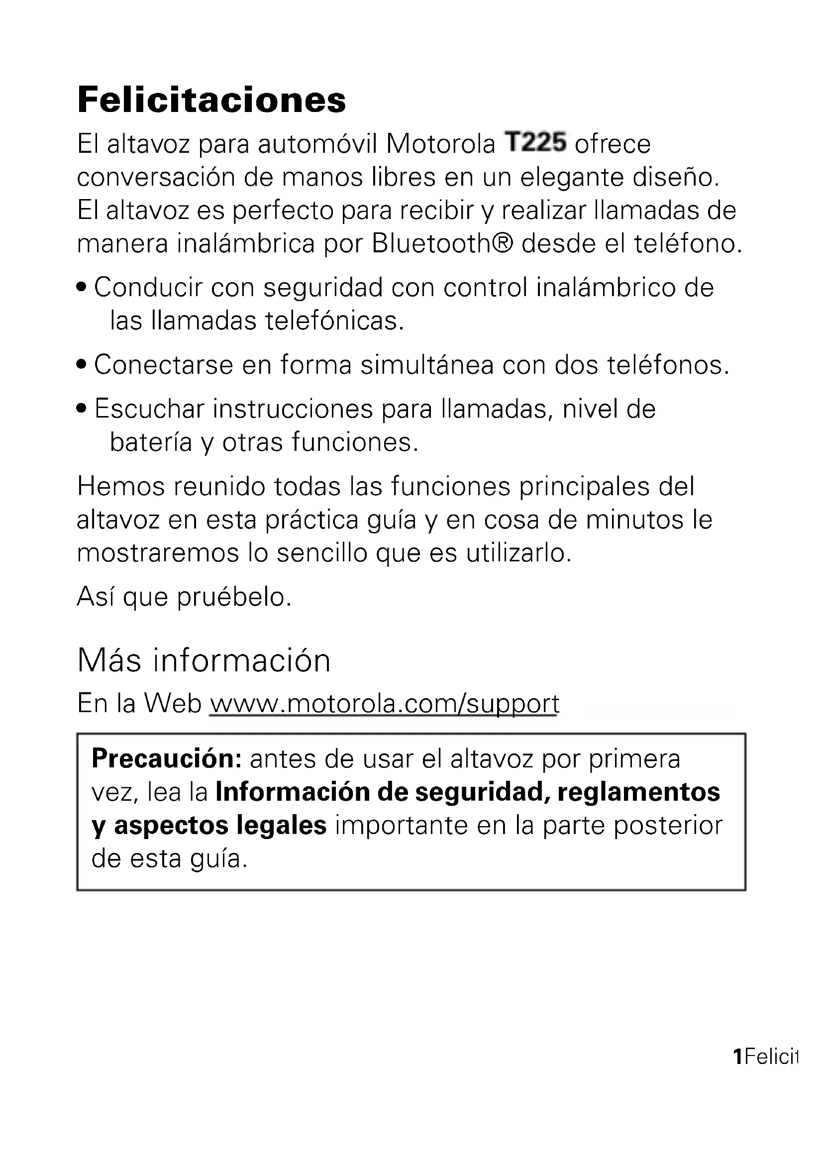 NEGLIGENCIA) POR DAÑOS QUE SUPEREN EL PRECIO DE COMPRA DEL PRODUCTO, ACCESORIO O SOFTWARE, O POR CUALQUIER DAÑO INDIRECTO, IMPREVISTO, ESPECIAL O RESULTANTE DE CUALQUIER TIPO O LA PÉRDIDA DE INGRESOS O UTILIDADES, PÉRDIDA DE NEGOCIOS, PÉRDIDA DE INFORMACIÓN O DATOS, SOFTWARE O APLICACIONES U OTRA PÉRDIDA FINANCIERA QUE SURJA DE LA CAPACIDAD O INCAPACIDAD DE USAR LOS PRODUCTOS, ACCESORIOS O SOFTWARE, O EN RELACIÓN CON LAS MISMAS, DENTRO DE LO PERMITIDO POR LA LEY. Algunos estados y jurisdicciones no permiten la limitación o exclusión de daños imprevistos o resultantes ni la limitación sobre la duración de una garantía implícita, de modo que las limitaciones o exclusiones anteriores probablemente no correspondan a su caso. Esta garantía le otorga derechos legales específicos y también podría tener otros derechos que varían de un estado a otro o de una jurisdicción a otra.29 Derechos de autor y marcas comerciales Motorola Mobility, Inc. Consumer Advocacy Office 600 N US Hwy 45 Libertyville, IL 60048 www.motorola.com Nota: no envíe el producto o a la dirección anterior. Si necesita devolver el producto para reparaciones, reemplazo o servicio de garantía, comuníquese con el Centro de Atención a Clientes de Motorola al: 1-800-331-6456 (Estados Unidos) 1-888-390-6456 (TTY/TDD Estados Unidos para personas con problemas de audición) 1-800-461-4575 (Canadá) Algunas funciones, servicios y aplicaciones dependen de la red y es probable que no estén disponibles en todas las áreas. Se pueden aplicar términos, condiciones y/o cargos adicionales. Comuníquese con el proveedor de servicios para obtener detalles. Todas las funciones, la funcionalidad y otras especificaciones del producto, así como la información incluida en esta guía, se basan en la información más reciente disponible, la que se considera precisa en el momento de la impresión. Motorola se reserva el derecho de cambiar o modificar cualquier información o especificación sin previo aviso ni obligación. MOTOROLA y el logotipo de la M estilizada son marcas comerciales o marcas comerciales registradas de Motorola Trademark Holdings, LLC. Todos los demás nombres de productos o de servicios pertenecen a sus respectivos dueños. © 2010 Motorola Mobility, Inc. Todos los derechos reservados. Precaución: los cambios o las modificaciones realizados en el teléfono radio que no estén aprobados expresamente por Motorola invalidarán la autoridad del usuario para operar el equipo. ID del producto: Motorola T225 Número de manual: 68014660001-AMOTOROLA T2251Félicitations! Félicitations! Le hautparleur pour la voiture T225 de Motorola permet d’avoir une conversation en mode mains libres et présente une conception profilée. Il s’agit de l’appareil idéal pour faire et recevoir des appels sans fil à partir de votre téléphone par l’intermédiaire de la technologie Bluetooth