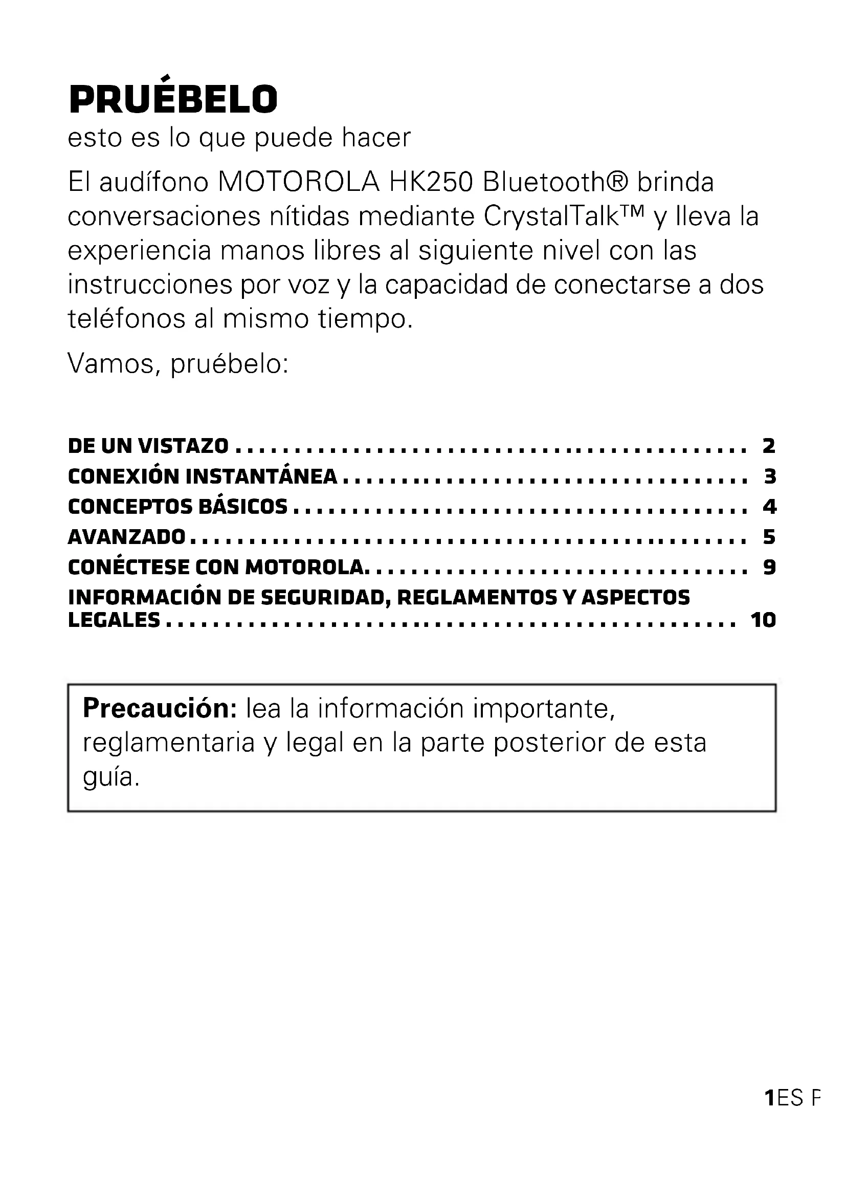 NEGLIGENCIA) POR DAÑOS QUE SUPEREN EL PRECIO DE COMPRA DEL PRODUCTO, ACCESORIO O SOFTWARE, O POR CUALQUIER DAÑO INDIRECTO, IMPREVISTO, ESPECIAL O RESULTANTE DE CUALQUIER TIPO O LA PÉRDIDA DE INGRESOS O UTILIDADES, PÉRDIDA DE NEGOCIOS, PÉRDIDA DE INFORMACIÓN O DATOS, SOFTWARE O APLICACIONES U OTRA PÉRDIDA FINANCIERA QUE SURJA DE LA CAPACIDAD O INCAPACIDAD DE USAR LOS PRODUCTOS, ACCESORIOS O SOFTWARE, O EN RELACIÓN CON LAS MISMAS, DENTRO DE LO PERMITIDO POR LA LEY. Algunos estados y jurisdicciones no permiten la limitación o exclusión de daños imprevistos o resultantes ni la limitación sobre la duración de una garantía implícita, de modo que las limitaciones o exclusiones anteriores probablemente no correspondan a su caso. Esta garantía le otorga derechos legales específicos y también podría tener otros derechos que varían de un estado a otro o de una jurisdicción a otra. EEUU 1-800-331-6456 Canadá 1-800-461-4575 TTY 1-888-390-645621 Derechos de autor y marcas comerciales Motorola Mobility, Inc. Consumer Advocacy Office 600 N US Hwy 45 Libertyville, IL 60048 www.motorola.com Nota: no envíe el producto a la dirección anterior. Si necesita devolver el producto para reparaciones, reemplazo o servicio de garantía, comuníquese con el Centro de atención a clientes de Motorola al: 1-800-331-6456 (Estados Unidos) 1-888-390-6456 (TTY/TDD en los Estados Unidos para personas con problemas de audición) 1-800-461-4575 (Canadá) Algunas funciones, servicios y aplicaciones dependen de la red y es probable que no estén disponibles en todas las áreas; pueden aplicarse términos, condiciones o cargos adicionales. Comuníquese con el proveedor de servicios para obtener detalles. Todas las funciones, la funcionalidad y otras especificaciones del producto, así como la información incluida en esta guía, se basan en la información más reciente disponible, la que se considera precisa en el momento de la impresión. Motorola se reserva el derecho de cambiar o modificar cualquier información o especificación sin previo aviso ni obligación. Nota: las imágenes incluidas en esta guía son sólo ejemplos. MOTOROLA y el logotipo de la M estilizada son marcas comerciales o marcas comerciales registradas de Motorola Trademark Holdings, LLC. Todos los demás nombres de productos o de servicios pertenecen a sus respectivos propietarios. © 2012 Motorola Mobility, Inc. Todos los derechos reservados. Precaución: Motorola no se responsabiliza por cambios/modificaciones realizados en este transceptor. ID de producto: Motorola HK250 Número de manual: 68016929001-AMOTOROLA HK250 FRÉcouteur Ki taFR27 janvier 20121FR Regardez ça! Regardez ça! voici ce que vous pouvez faire Votre écouteur Bluetooth