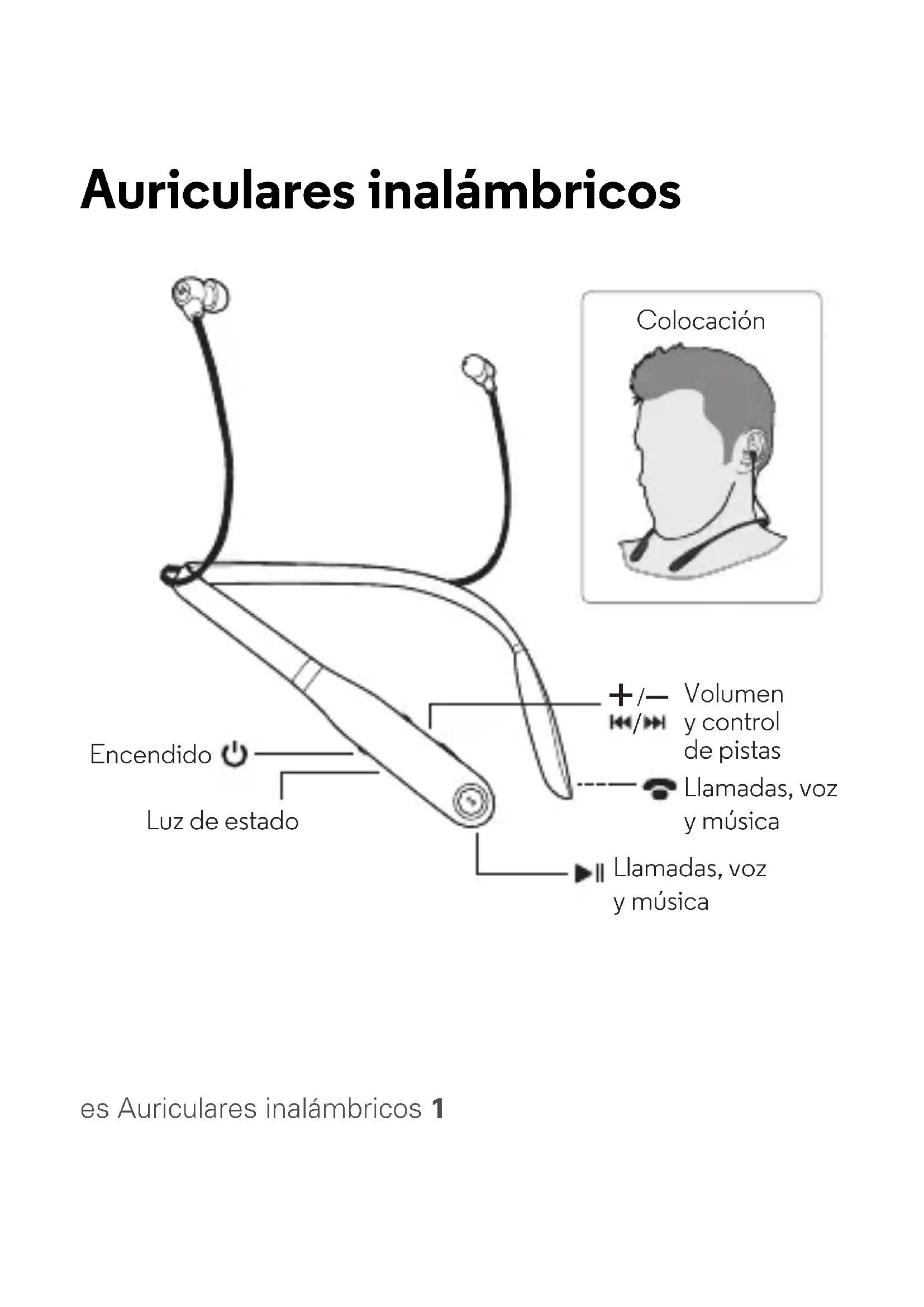 La luz parpadea en color azul. La luz se enciende en color azul fijo.es Controles de llamadas, voz y música 5 Controles de llamadas, voz y música Los botones de los extremos de los auriculares realizan las mismas funciones. Pulse cualquiera de los botones para controlar las llamadas, los comandos de voz y la música. Nota: Los comandos de voz pueden no funcionar en todos los dispositivos o en todos los idiomas Nota: Algunas funciones dependen del teléfono o la red. Aumentar el volumen
