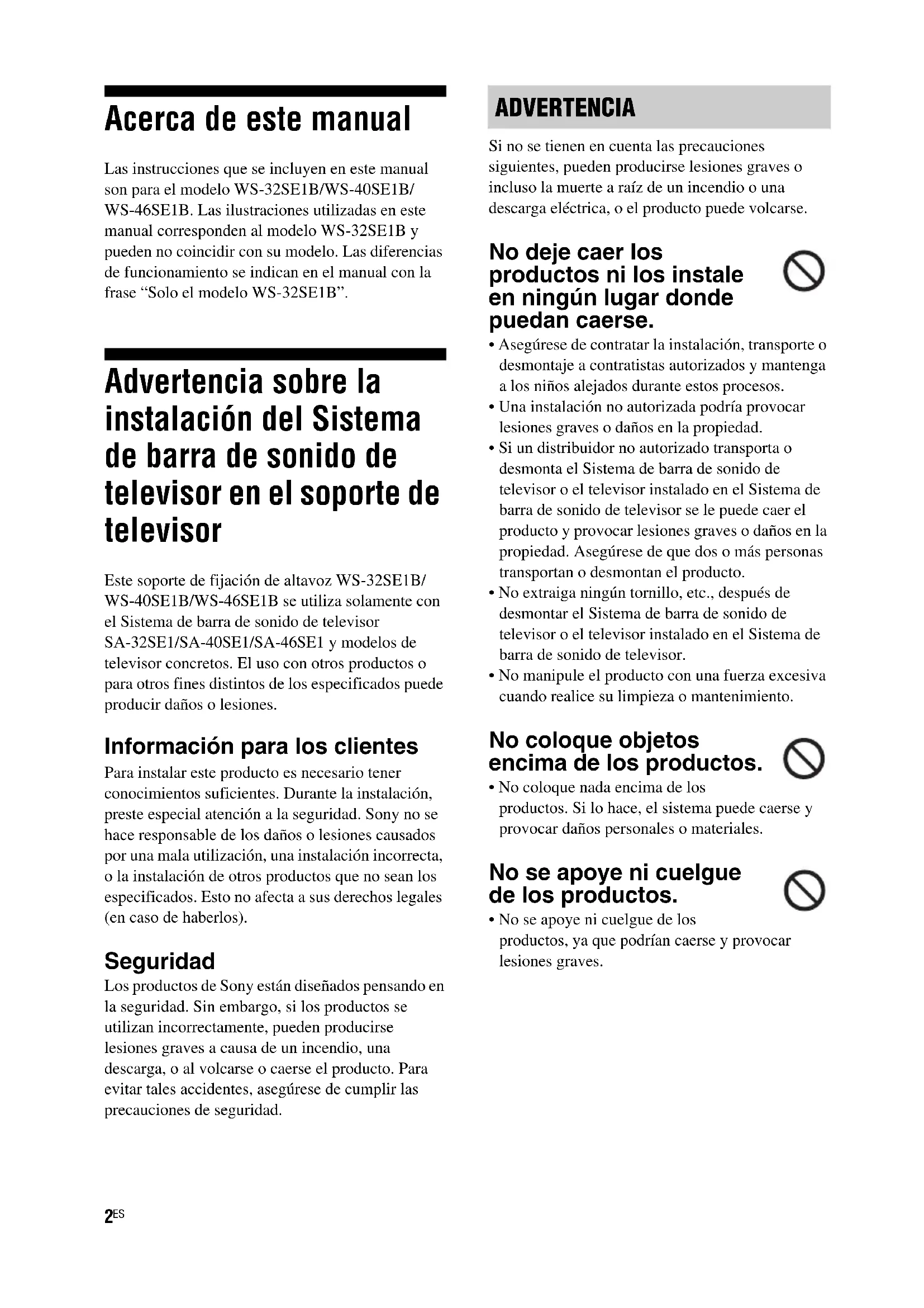Acerca de este manual Las instrucciones que se incluyen en este manual son para el modelo WS-32SE1B/WS-40SE1B/ WS-46SE1B. Las ilustraciones utilizadas en este manual corresponden al modelo WS-32SE1B y pueden no coincidir con su modelo. Las diferencias de funcionamiento se indican en el manual con la frase “Solo el modelo WS-32SE1B”. Advertencia sobre la instalación del Sistema de barra de sonido de televisor en el soporte de televisor Este soporte de fijación de altavoz WS-32SE1B/ WS-40SE1B/WS-46SE1B se utiliza solamente con el Sistema de barra de sonido de televisor SA-32SE1/SA-40SE1/SA-46SE1 y modelos de televisor concretos. El uso con otros productos o para otros fines distintos de los especificados puede producir daños o lesiones. Información para los clientes Para instalar este producto es necesario tener conocimientos suficientes. Durante la instalación, preste especial atención a la seguridad. Sony no se hace responsable de los daños o lesiones causados por una mala utilización, una instalación incorrecta, o la instalación de otros productos que no sean los especificados. Esto no afecta a sus derechos legales (en caso de haberlos). Seguridad Los productos de Sony están diseñados pensando en la seguridad. Sin embargo, si los productos se utilizan incorrectamente, pueden producirse lesiones graves a causa de un incendio, una descarga, o al volcarse o caerse el producto. Para evitar tales accidentes, asegúrese de cumplir las precauciones de seguridad. Si no se tienen en cuenta las precauciones siguientes, pueden producirse lesiones graves o incluso la muerte a raíz de un incendio o una descarga eléctrica, o el producto puede volcarse. No deje caer los productos ni los instale en ningún lugar donde puedan caerse.