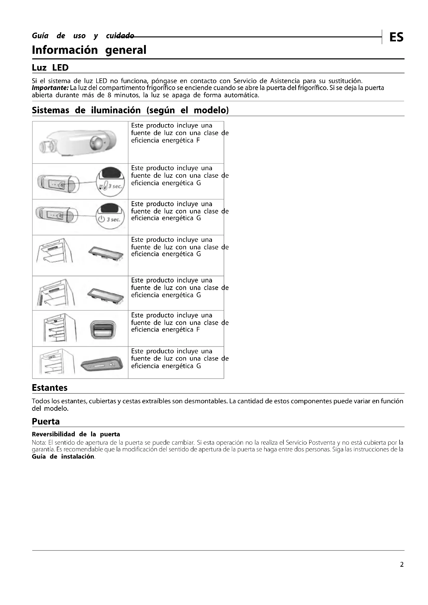 Información general Luz LED Si el sistema de luz LED no funciona, póngase en contacto con Servicio de Asistencia para su sustitución. Importante: La luz del compartimento frigorífico se enciende cuando se abre la puerta del frigorífico. Si se deja la puerta abierta durante más de 8 minutos, la luz se apaga de forma automática. Sistemas de iluminación (según el modelo) Este producto incluye una fuente de luz con una clase de eficiencia energética F Este producto incluye una fuente de luz con una clase de eficiencia energética G Este producto incluye una fuente de luz con una clase de eficiencia energética G Este producto incluye una fuente de luz con una clase de eficiencia energética G Este producto incluye una fuente de luz con una clase de eficiencia energética G Este producto incluye una fuente de luz con una clase de eficiencia energética F Este producto incluye una fuente de luz con una clase de eficiencia energética G Estantes Todos los estantes, cubiertas y cestas extraíbles son desmontables. La cantidad de estos componentes puede variar en función del modelo. Puerta Reversibilidad de la puerta Nota: El sentido de apertura de la puerta se puede cambiar. Si esta operación no la realiza el Servicio Postventa y no está cubierta por la garantía. Es recomendable que la modificación del sentido de apertura de la puerta se haga entre dos personas. Siga las instrucciones de la Guía de instalación.Guía de uso y cuidado