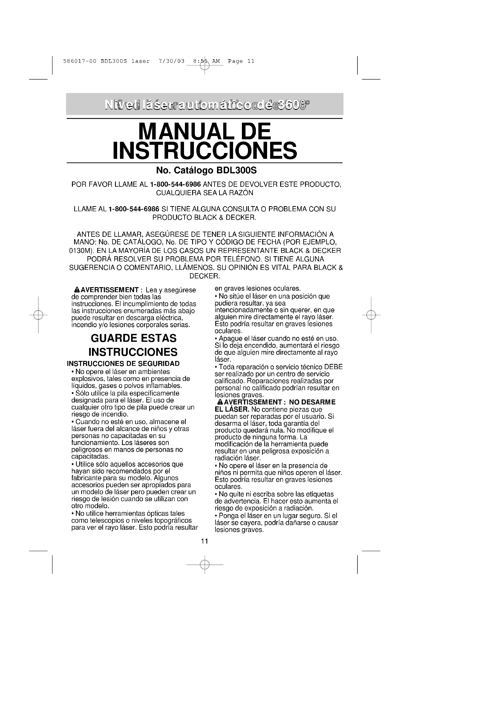 LLAME AL 1-800-544-6986 SI TIENE ALGUNA CONSULTA O PROBLEMA CON SU PRODUCTO BLACK & DECKER. ANTES DE LLAMAR, ASEGÚRESE DE TENER LA SIGUIENTE INFORMACIÓN A MANO: No. DE CATÁLOGO, No. DE TIPO Y CÓDIGO DE FECHA (POR EJEMPLO, 0130M). EN LA MAYORÍA DE LOS CASOS UN REPRESENTANTE BLACK & DECKER PODRÁ RESOLVER SU PROBLEMA POR TELÉFONO. SI TIENE ALGUNA SUGERENCIA O COMENTARIO, LLÁMENOS. SU OPINIÓN ES VITAL PARA BLACK & DECKER. 586017-00 BDL300S laser 7/30/03 8:51 AM Page 11• ATENCIÓN: Tenga cautela cuando taladre, clave o corte a través de paredes, pisos y techos que puedan contener cableado eléctrico o tuberías. Siempre corte la electricidad cuando trabaje cerca de cables eléctricos. ATENCIÓN: El control, ajuste o realización de otros procedimientos, fuera de los especificados en este manual, pueden resultar en una peligrosa exposición a radiación láser. Su herramienta tiene una etiqueta que puede incluir los siguientes símbolos: V--------------------------------voltios mW-----------------------------milivatios nm------------------------------longitud de onda en nanómetros IIIa------------------------------láser clase IIIa Para su conveniencia y seguridad, su láser tiene las siguientes etiquetas: