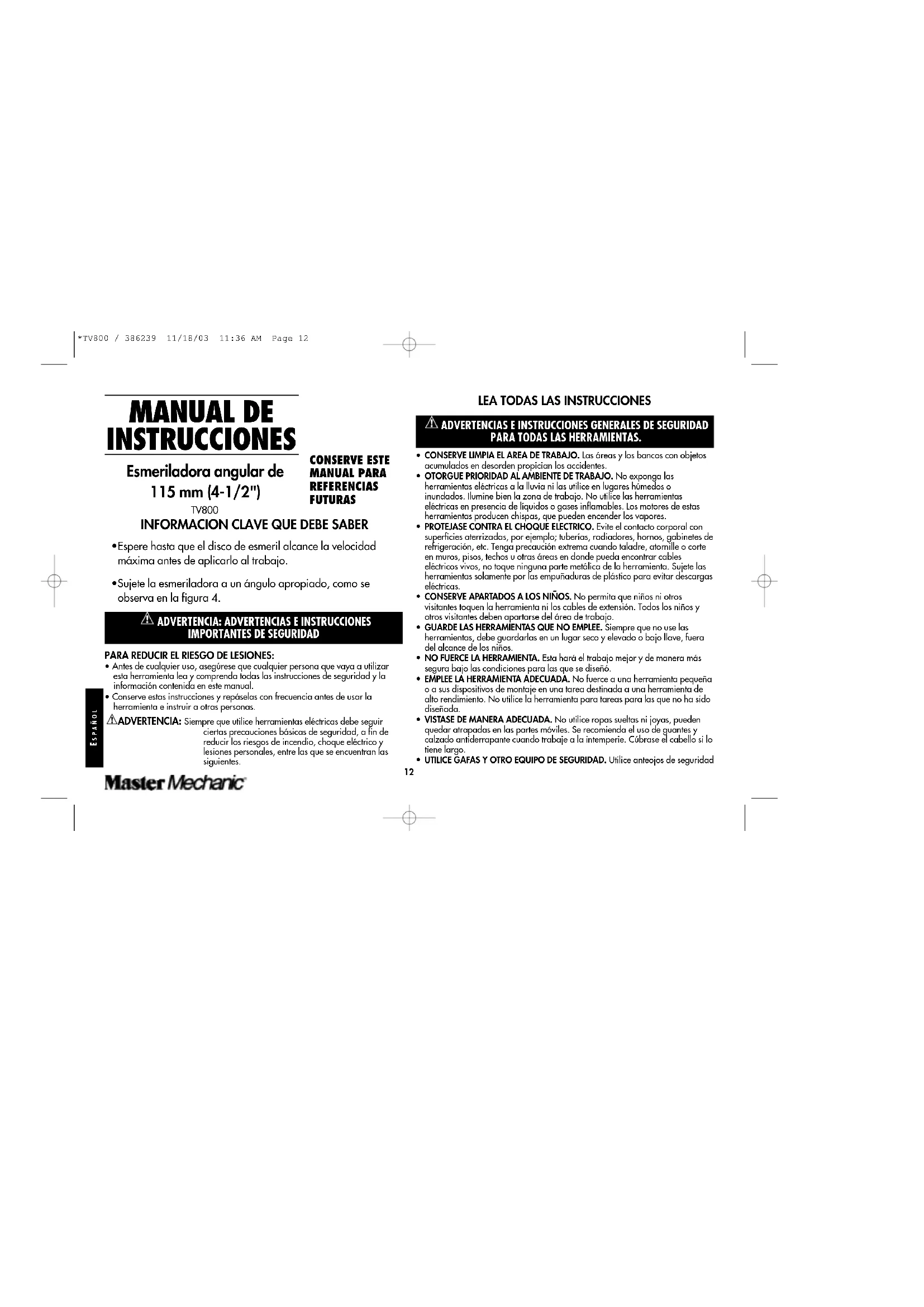 o superior a la velocidad indicada para la esmeriladora en la placa de identificación. *TV800 / 386239 11/18/03 11:36 AM Page 15E SPAÑOL