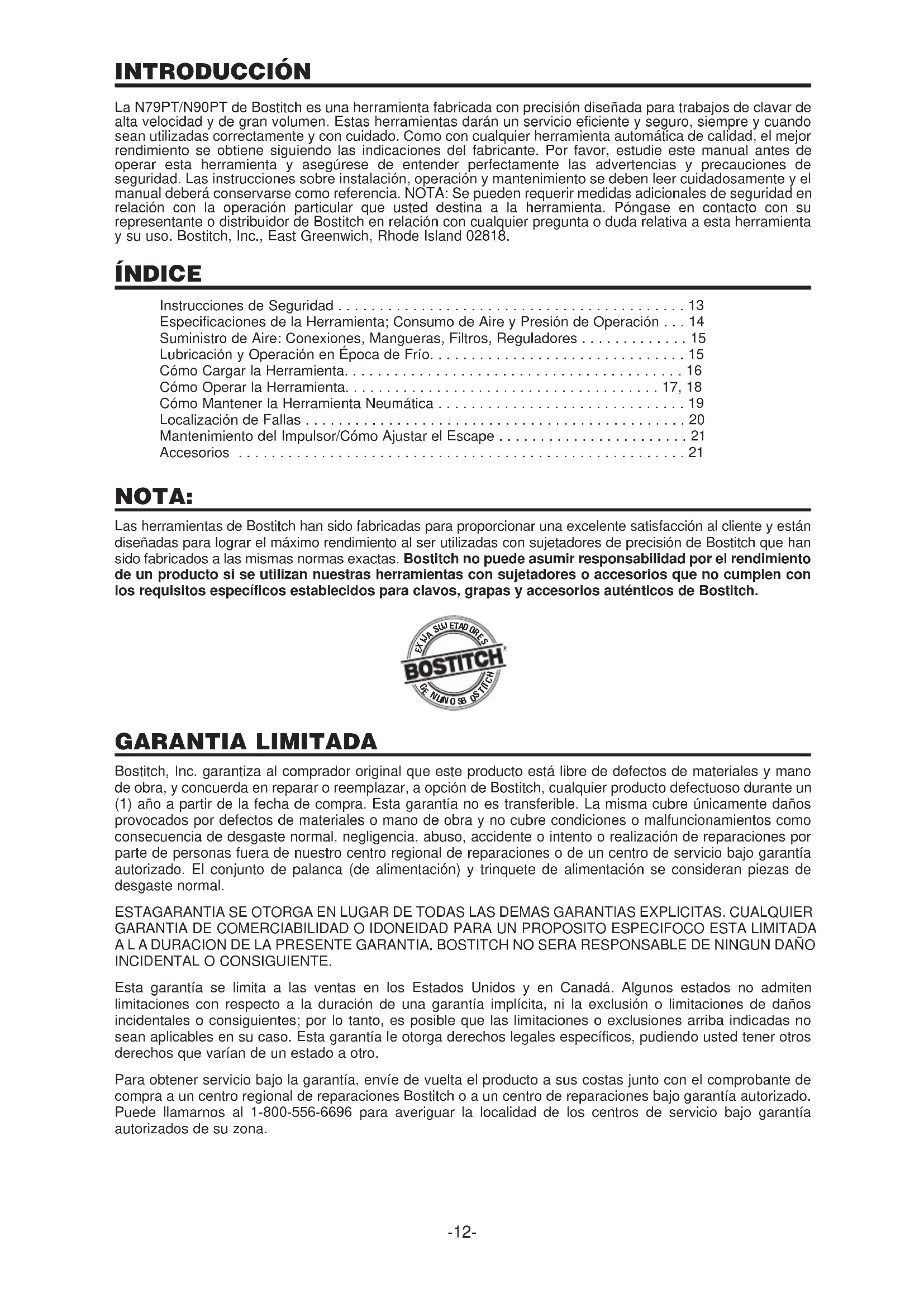- Standard Length (160.2mm - 160.7mm) Always disconnect air supply before making adjustments.-12- INTRODUCCIÓN La N79PT/N90PT de Bostitch es una herramienta fabricada con precisión diseñada para trabajos de clavar de alta velocidad y de gran volumen. Estas herramientas darán un servicio eficiente y seguro, siempre y cuando sean utilizadas correctamente y con cuidado. Como con cualquier herramienta automática de calidad, el mejor rendimiento se obtiene siguiendo las indicaciones del fabricante. Por favor, estudie este manual antes de operar esta herramienta y asegúrese de entender perfectamente las advertencias y precauciones de seguridad. Las instrucciones sobre instalación, operación y mantenimiento se deben leer cuidadosamente y el manual deberá conservarse como referencia. NOTA: Se pueden requerir medidas adicionales de seguridad en relación con la operación particular que usted destina a la herramienta. Póngase en contacto con su representante o distribuidor de Bostitch en relación con cualquier pregunta o duda relativa a esta herramienta y su uso. Bostitch, Inc., East Greenwich, Rhode Island 02818. ÍNDICE Instrucciones de Seguridad p. 13