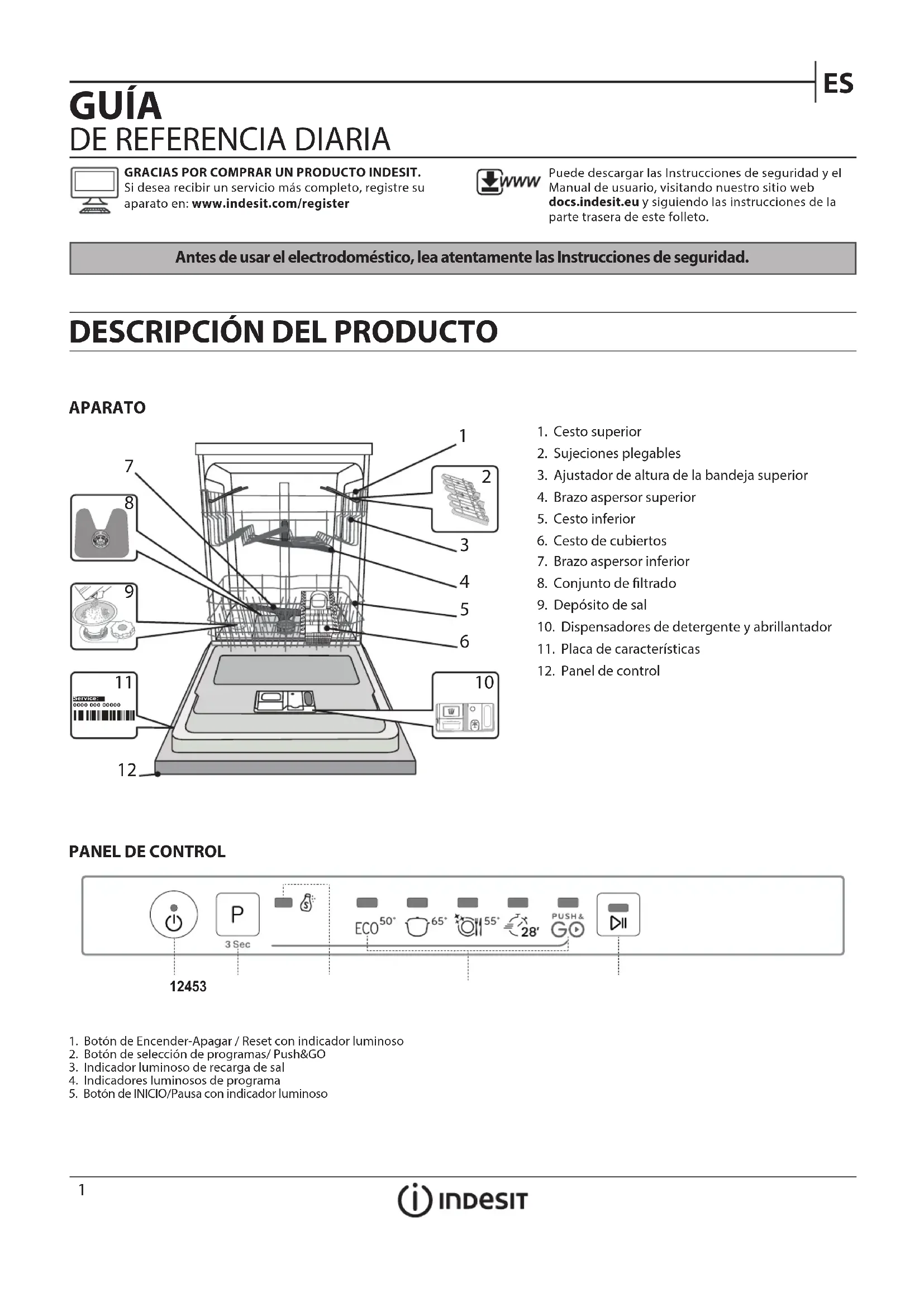 1. Botón de Encender-Apagar / Reset con indicador luminoso2. Botón de selección de programas/ Push&GO3. Indicador luminoso de recarga de sal4. Indicadores luminosos de programa5. Botón de INICIO/Pausa con indicador luminosoGRACIAS POR COMPRAR UN PRODUCTO INDESIT. Si desea recibir un servicio más completo, registre su aparato en: www.indesit.com/registerPuede descargar las Instrucciones de seguridad y el Manual de usuario, visitando nuestro sitio web docs.indesit.eu y siguiendo las instrucciones de la parte trasera de este folleto.1. Cesto superior2. Sujeciones plegables3. Ajustador de altura de la bandeja superior4. Brazo aspersor superior5. Cesto inferior6. Cesto de cubiertos7. Brazo aspersor inferior8. Conjunto de ltrado9. Depósito de sal10. Dispensadores de detergente y abrillantador11. Placa de características12. Panel de control1 2 4 530000 000 00000 Service: