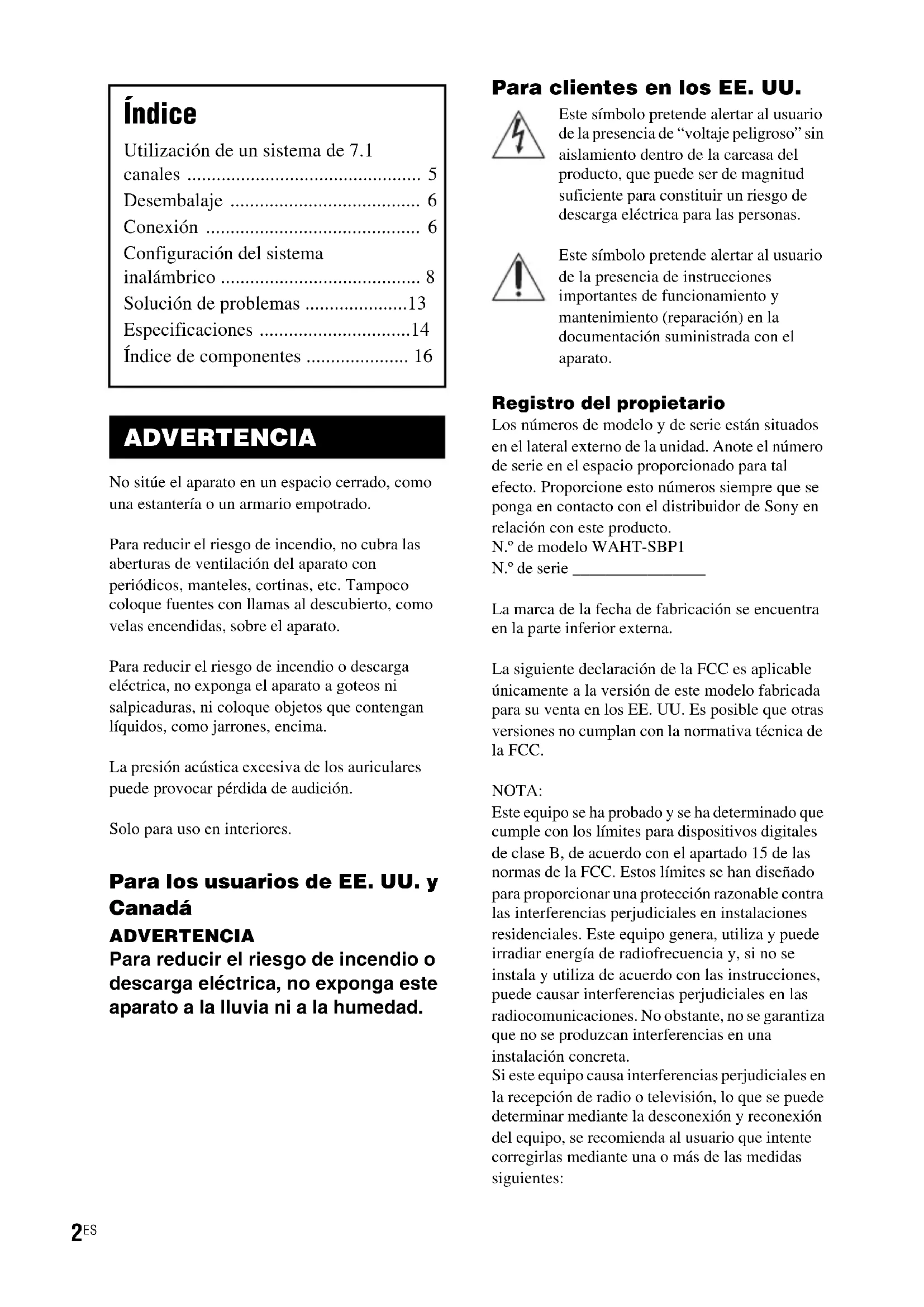 - No sitúe el aparato en un espacio cerrado, como una estantería o un armario empotrado.Para reducir el riesgo de incendio, no cubra las aberturas de ventilación del aparato con periódicos, manteles, cortinas, etc. Tampoco coloque fuentes con llamas al descubierto, como velas encendidas, sobre el aparato.Para reducir el riesgo de incendio o descarga eléctrica, no exponga el aparato a goteos ni salpicaduras, ni coloque objetos que contengan líquidos, como jarrones, encima.La presión acústica excesiva de los auriculares puede provocar pérdida de audición.Solo para uso en interiores. Para los usuarios de EE. UU. y Canadá ADVERTENCIA Para reducir el riesgo de incendio o descarga eléctrica, no exponga este aparato a la lluvia ni a la humedad. Para clientes en los EE. UU. Este símbolo pretende alertar al usuario de la presencia de “voltaje peligroso” sin aislamiento dentro de la carcasa del producto, que puede ser de magnitud suficiente para constituir un riesgo de descarga eléctrica para las personas.Este símbolo pretende alertar al usuario de la presencia de instrucciones importantes de funcionamiento y mantenimiento (reparación) en la documentación suministrada con el aparato. Registro del propietario Los números de modelo y de serie están situados en el lateral externo de la unidad. Anote el número de serie en el espacio proporcionado para tal efecto. Proporcione esto números siempre que se ponga en contacto con el distribuidor de Sony en relación con este producto.N.º de modelo WAHT-SBP1N.º de serie ________________La marca de la fecha de fabricación se encuentra en la parte inferior externa.La siguiente declaración de la FCC es aplicable únicamente a la versión de este modelo fabricada para su venta en los EE. UU. Es posible que otras versiones no cumplan con la normativa técnica de la FCC.NOTA:Este equipo se ha probado y se ha determinado que cumple con los límites para dispositivos digitales de clase B, de acuerdo con el apartado 15 de las normas de la FCC. Estos límites se han diseñado para proporcionar una protección razonable contra las interferencias perjudiciales en instalaciones residenciales. Este equipo genera, utiliza y puede irradiar energía de radiofrecuencia y, si no se instala y utiliza de acuerdo con las instrucciones, puede causar interferencias perjudiciales en las radiocomunicaciones. No obstante, no se garantiza que no se produzcan interferencias en una instalación concreta. Si este equipo causa interferencias perjudiciales en la recepción de radio o televisión, lo que se puede determinar mediante la desconexión y reconexión del equipo, se recomienda al usuario que intente corregirlas mediante una o más de las medidas siguientes: Índice Utilización de un sistema de 7.1 canales p. 5