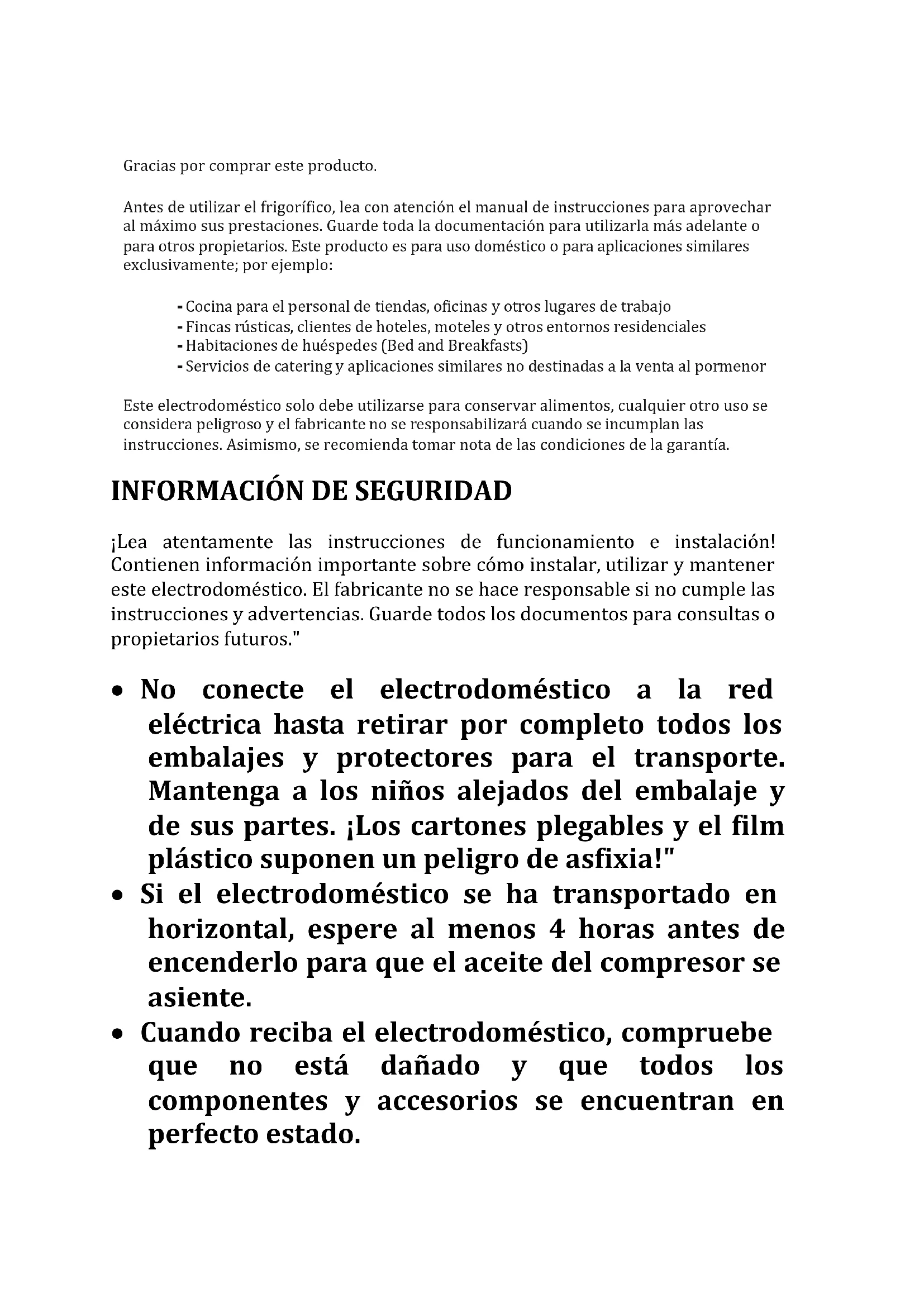 Gracias por comprar este producto. Antes de utilizar el frigorífico, lea con atención el manual de instrucciones para aprovechar al máximo sus prestaciones. Guarde toda la documentación para utilizarla más adelante o para otros propietarios. Este producto es para uso doméstico o para aplicaciones similares exclusivamente; por ejemplo: - Cocina para el personal de tiendas, oficinas y otros lugares de trabajo - Fincas rústicas, clientes de hoteles, moteles y otros entornos residenciales - Habitaciones de huéspedes (Bed and Breakfasts) - Servicios de catering y aplicaciones similares no destinadas a la venta al pormenor Este electrodoméstico solo debe utilizarse para conservar alimentos, cualquier otro uso se considera peligroso y el fabricante no se responsabilizará cuando se incumplan las instrucciones. Asimismo, se recomienda tomar nota de las condiciones de la garantía.