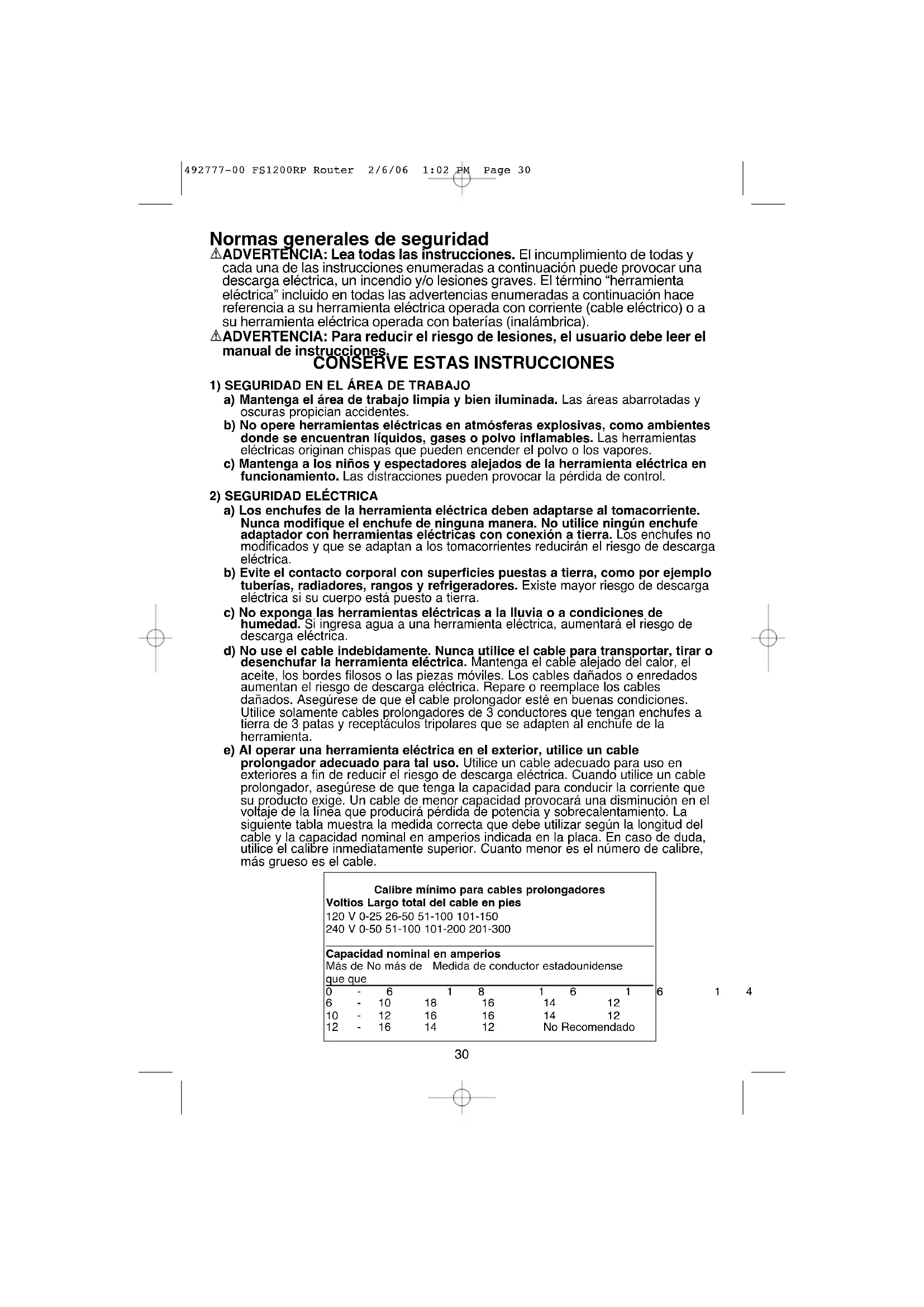 492777-00 FS1200RP Router 2/6/06 1:02 PM Page 2930 Normas generales de seguridad ADVERTENCIA: Lea todas las instrucciones. El incumplimiento de todas y cada una de las instrucciones enumeradas a continuación puede provocar una descarga eléctrica, un incendio y/o lesiones graves. El término “herramienta eléctrica” incluido en todas las advertencias enumeradas a continuación hace referencia a su herramienta eléctrica operada con corriente (cable eléctrico) o a su herramienta eléctrica operada con baterías (inalámbrica). ADVERTENCIA: Para reducir el riesgo de lesiones, el usuario debe leer el manual de instrucciones.