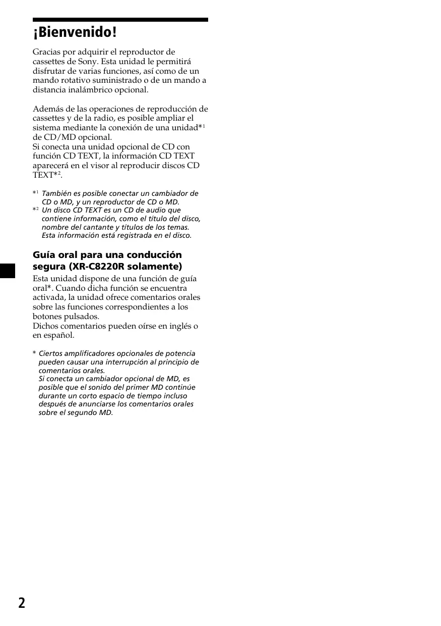 Gracias por adquirir el reproductor de cassettes de Sony. Esta unidad le permitirá disfrutar de varias funciones, así como de un mando rotativo suministrado o de un mando a distancia inalámbrico opcional. Además de las operaciones de reproducción de cassettes y de la radio, es posible ampliar el sistema mediante la conexión de una unidad*1 de CD/MD opcional. Si conecta una unidad opcional de CD con función CD TEXT, la información CD TEXT aparecerá en el visor al reproducir discos CD TEXT*2. *1 También es posible conectar un cambiador de CD o MD, y un reproductor de CD o MD. *2 Un disco CD TEXT es un CD de audio que contiene información, como el título del disco, nombre del cantante y títulos de los temas. Esta información está registrada en el disco.