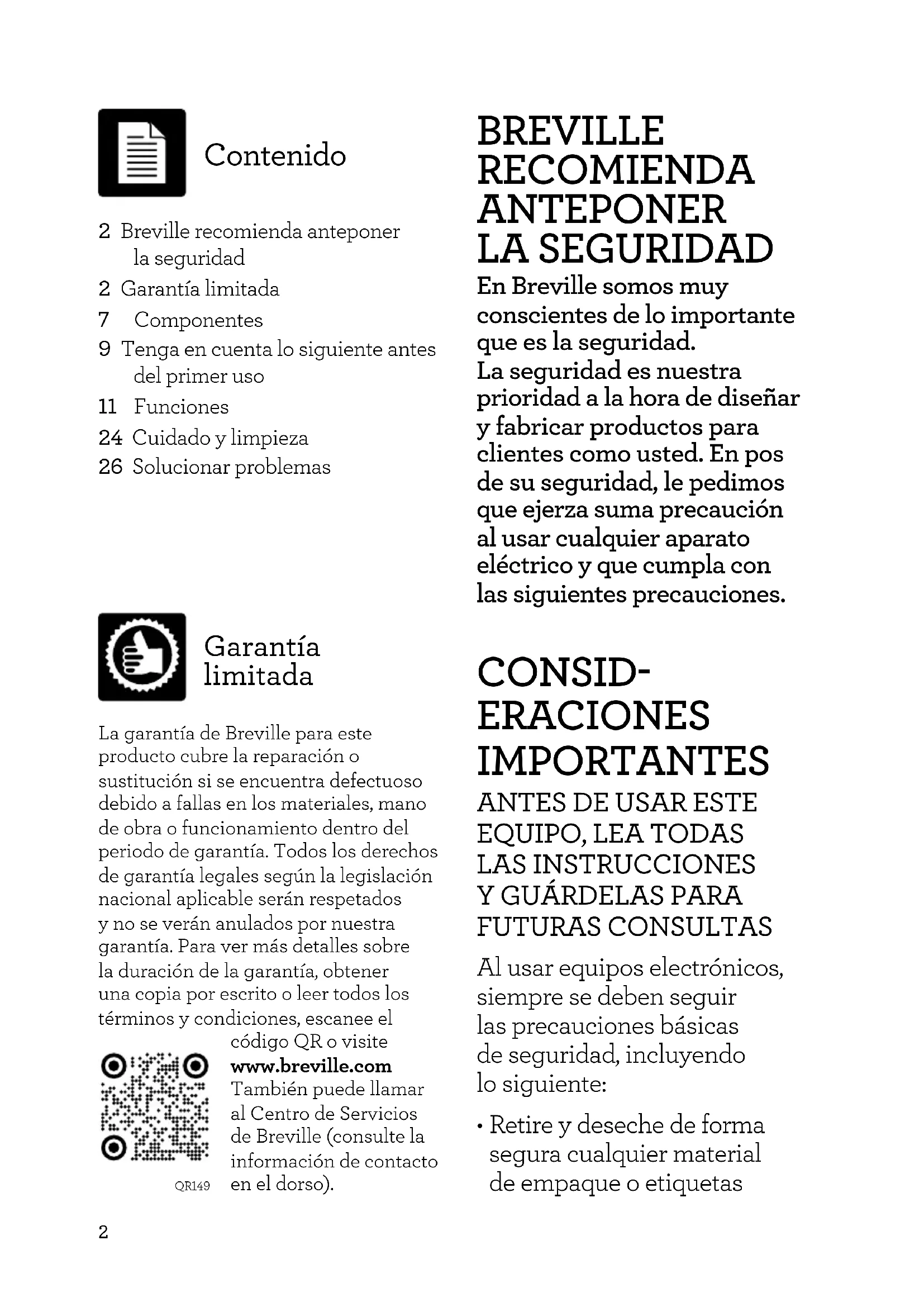 - Retire y deseche de forma segura cualquier material de empaque o etiquetas Contenido 2 Breville recomienda anteponer laseguridad2 Garantía limitada7 Componentes9 Tenga en cuenta lo siguiente antes del primer uso11 Funciones24 Cuidado ylimpieza26 Solucionar problemas Garantía limitada La garantía de Breville para este producto cubre la reparación o sustitución si se encuentra defectuoso debido a fallas en los materiales, mano de obra o funcionamiento dentro del periodo de garantía. Todos los derechos de garantía legales según la legislación nacional aplicable serán respetados y no se verán anulados por nuestra garantía. Para ver más detalles sobre la duración de la garantía, obtener una copia por escrito o leer todos los términos y condiciones, escanee el código QR o visite www.breville.com También puede llamar al Centro de Servicios de Breville (consulte la información de contacto en el dorso).QR149ES-MX