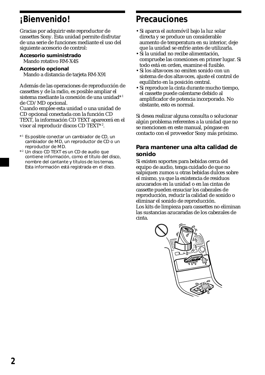 Si existen soportes para bebidas cerca del equipo de audio, tenga cuidado de que no salpiquen zumos u otras bebidas dulces sobre el mismo, ya que la existencia de residuos azucarados en la unidad o en las cintas de cassette pueden ensuciar los cabezales de reproducción, reducir la calidad de sonido o eliminar el sonido de reproducción. Los kits de limpieza para cassettes no eliminan las sustancias azucaradas de los cabezales de cinta.
