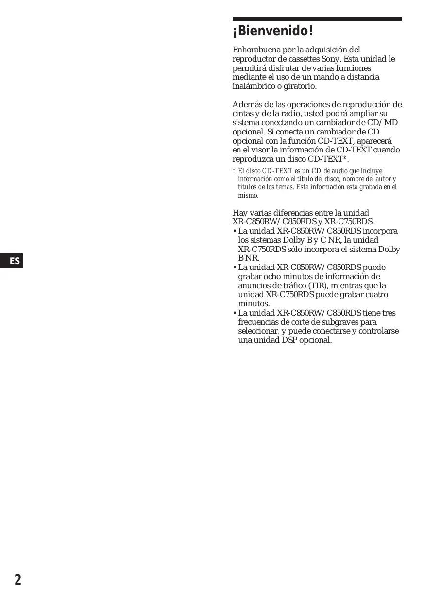 Enhorabuena por la adquisición del reproductor de cassettes Sony. Esta unidad le permitirá disfrutar de varias funciones mediante el uso de un mando a distancia inalámbrico o giratorio. Además de las operaciones de reproducción de cintas y de la radio, usted podrá ampliar su sistema conectando un cambiador de CD/MD opcional. Si conecta un cambiador de CD opcional con la función CD-TEXT, aparecerá en el visor la información de CD-TEXT cuando reproduzca un disco CD-TEXT*. * El disco CD-TEXT es un CD de audio que incluye información como el título del disco, nombre del autor y títulos de los temas. Esta información está grabada en el mismo.