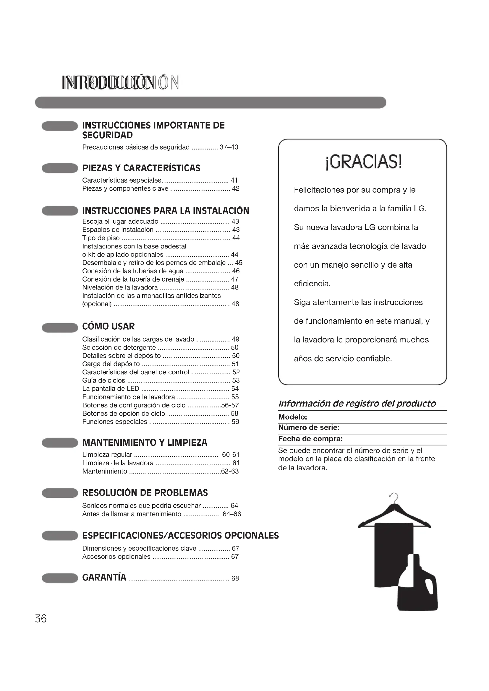 SEGURIDAD Precauciones básicas de seguridad .............. 37–40Dimensiones y especificaciones clave ................. 67 Accesorios opcionales ......................................... 67 Felicitaciones por su compra y le damos la bienvenida a la familia LG. Su nueva lavadora LG combina la más avanzada tecnología de lavado con un manejo sencillo y de alta eficiencia. Siga atentamente las instrucciones de funcionamiento en este manual, y la lavadora le proporcionará muchos años de servicio confiable. ¡GRACIAS!