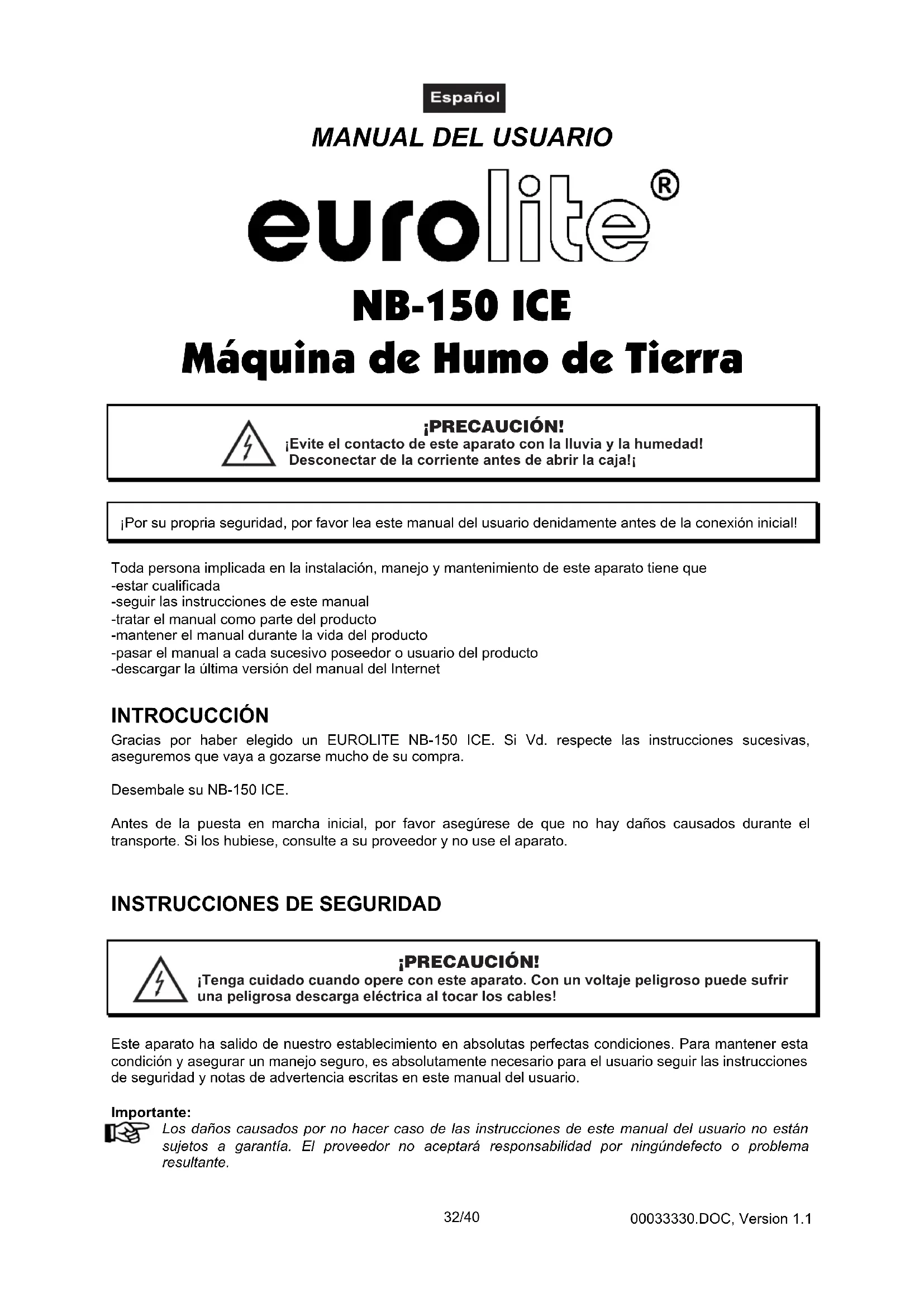 NB-150 ICE Máquina de Humo de Tierra ¡Eviteelcontactodeesteaparatoconlalluviaylahumedad!Desconectardelacorrienteantesdeabrirlacaja!¡ ¡PRECAUCIÓN! ¡Por su propria seguridad, por favor lea este manual del usuario denidamente antes de la conexión inicial!Toda persona implicada en la instalación, manejo y mantenimiento de este aparato tiene que-estar cualificada-seguir las instrucciones de este manual-tratar el manual como parte del producto-mantener el manual durante la vida del producto-pasar el manual a cada sucesivo poseedor o usuario del producto-descargar la última versión del manual del Internet INTROCUCCIÓN Gracias por haber elegido un EUROLITE NB-150 ICE. Si Vd. respecte las instrucciones sucesivas,aseguremos que vaya a gozarse mucho de su compra.Desembale su NB-150 ICE.Antes de la puesta en marcha inicial, por favor asegúrese de que no hay daños causados durante eltransporte. Si los hubiese, consulte a su proveedor y no use el aparato.