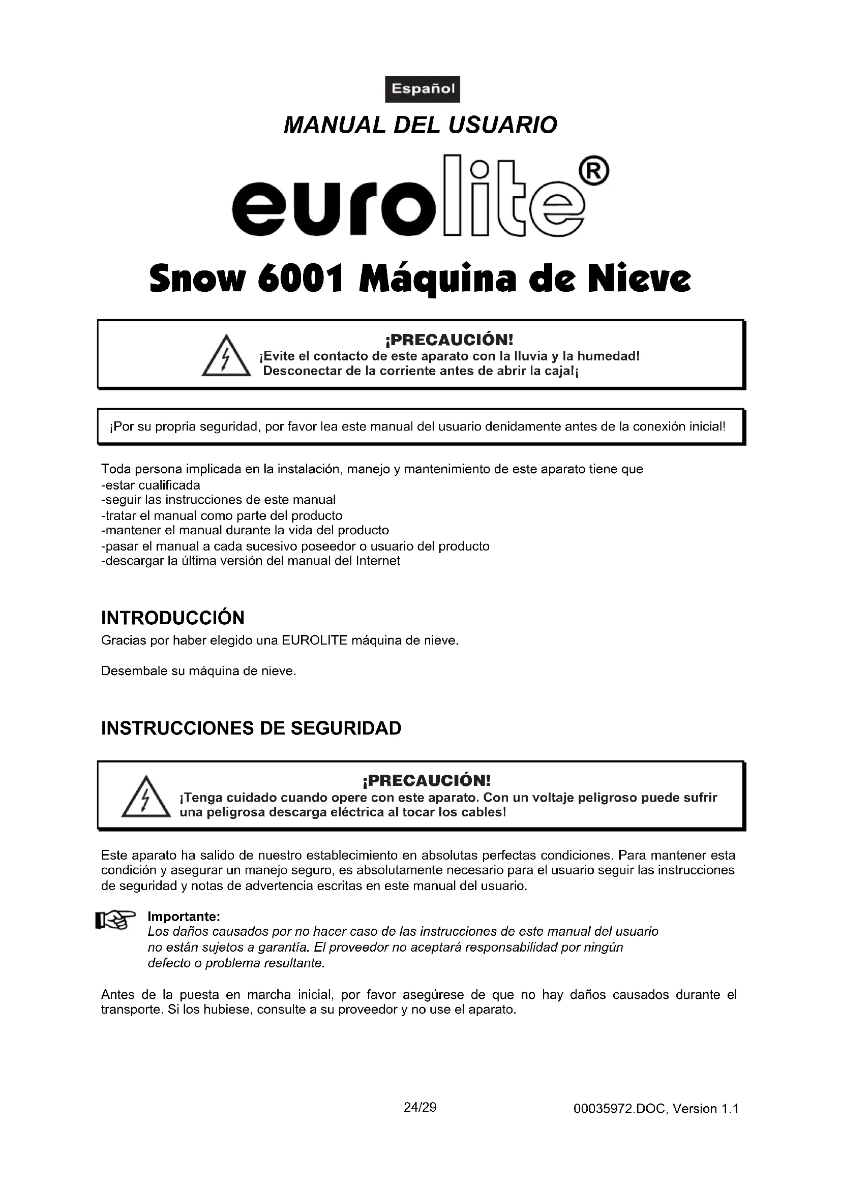 Snow 6001 Máquina de Nieve ¡Eviteelcontactodeesteaparatoconlalluviaylahumedad!Desconectardelacorrienteantesdeabrirlacaja!¡ ¡PRECAUCIÓN! ¡Por su propria seguridad, por favor lea este manual del usuario denidamente antes de la conexión inicial!Toda persona implicada en la instalación, manejo y mantenimiento de este aparato tiene que-estar cualificada-seguir las instrucciones de este manual-tratar el manual como parte del producto-mantener el manual durante la vida del producto-pasar el manual a cada sucesivo poseedor o usuario del producto-descargar la última versión del manual del Internet INTRODUCCIÓN Gracias por haber elegido una EUROLITE máquina de nieve.Desembale su máquina de nieve.