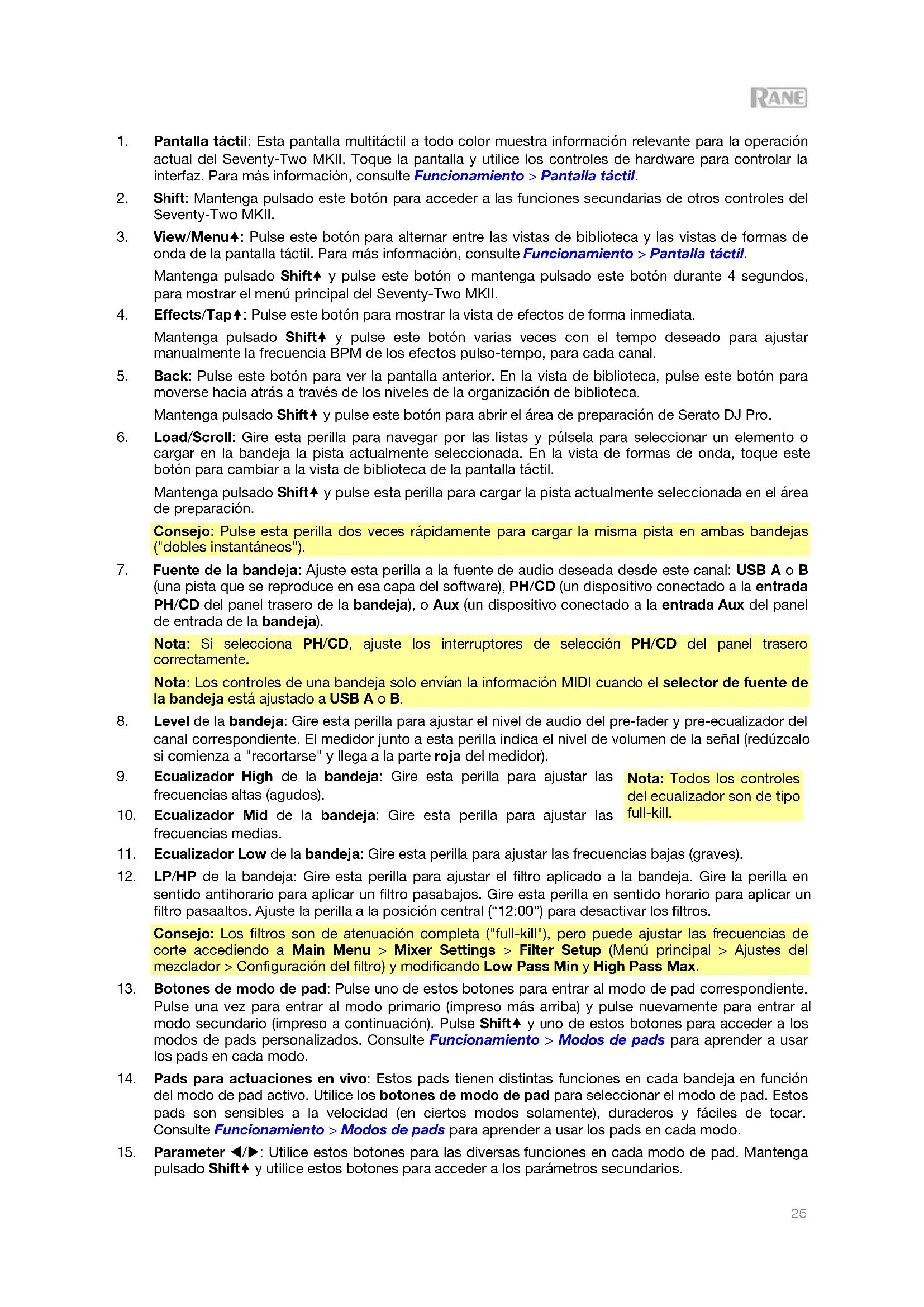 iew Top Panel Fader Plate Tension Screw22 Guía del usuario (Español) Introducción Gracias por comprar el Seventy-Two MKII. En Rane DJ, sabemos que usted se toma la música en serio. Por eso es que diseñamos nuestros equipos con una sola cosa en mente— hacer que pueda tocar su mejor interpretación.