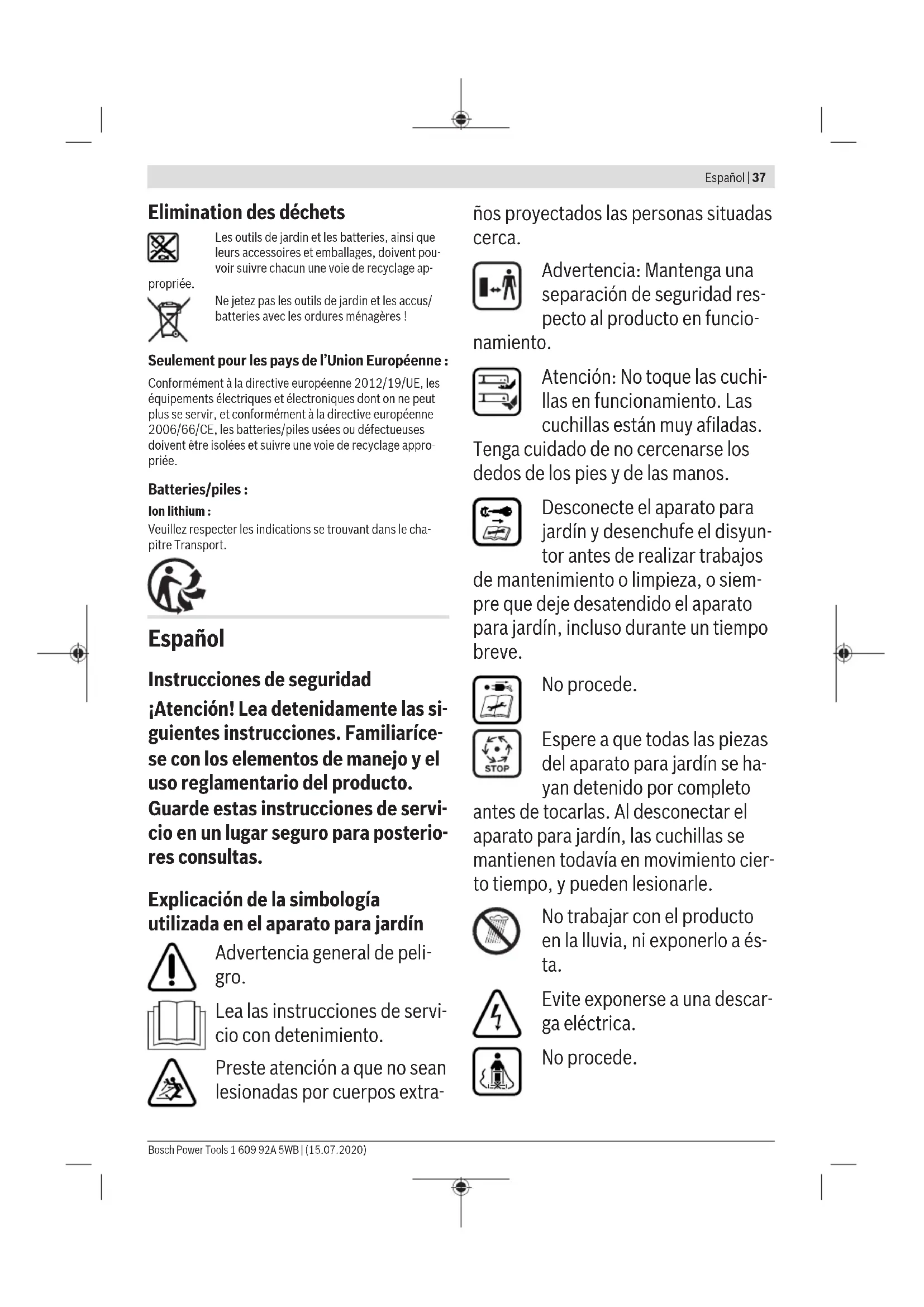 Laisser refroidir le moteur et régler sur une hau- teur de coupe plus élevée L’outil de jardin coupe l’herbe de manière irré- gulière et/ou le moteur fonctionne avec difficulté Hauteur de coupe trop basse Régler sur une hauteur de coupe plus élevée Les lames sont émoussées Changer les lames (voir figure K) Blocages possibles Éteindre l’outil de jardin et débrancher le disjonc- teur Le cas échéant, contrôler la face inférieure de l’outil de jardin et la dégager si nécessaire (tou- jours porter des gants de jardinage) Lames montées dans le faux sens Monter les lames dans le bon sens La lame ne tourne pas après avoir mis en marche l’outil de jardin La lame est bloquée par l’herbe Éteindre l’outil de jardin et débrancher le disjonc- teur Enlever l’obturation (toujours porter des gants de jardinage) Écrou/vis de la lame desserré Resserrer l’écrou/la vis de la lame (27Nm) Vibrations/bruits ex- cessifs Écrou/vis de la lame desserré Resserrer l’écrou/la vis de la lame (27Nm) La lame est endommagée Changer les lames (voir figure K) Batterie et chargeur Bosch Power Tools 1 609 92A 5WB | (15.07.2020)36 | Français Problème Cause possible Remède Le voyant rouge indi- quant la charge de la batterie clignote sur le chargeur Aucun processus de charge possible La batterie n’a pas été (correctement) mise en place Mettre la batterie correctement en place sur le chargeur Contacts de la batterie encrassés Nettoyer les contacts; p. ex. en mettant et en reti- rant la batterie à plusieurs reprises, le cas échéant, remplacer la batterie Batterie défectueuse Remplacer la batterie L’indicateur de charge de la batterie n’est pas allumé sur le chargeur La fiche secteur du chargeur n’est pas (correcte- ment) branchée Brancher la fiche (complètement) sur la prise de courant Prise de courant, câble de secteur ou chargeur défectueux Vérifier la tension du secteur, le cas échéant, faire contrôler le chargeur par une station de Service Après-Vente agréée pour outillage Bosch Entretien et Service Après‑Vente Entretien de la batterie u Attention! Arrêtez l’outil de jardin, déconnectez le sectionneur et retirez la batterie ainsi que le bac de ra- massage avant d’effectuer des réparations ou de net- toyer l’outil de jardin. u Portez toujours des gants de jardinage quand vous manipulez l’appareil ou que vous travaillez près des lames aiguisées. Respectez les indications et mesures suivantes qui per- mettent une utilisation optimale de la batterie: – Protéger la batterie de l’humidité et de l’eau. – Ne rangez l’outil de jardin et la batterie qu’à une plage de température entre -20°C et 50°C. Ne laissez pas la batte- rie p. ex. dans une voiture en été. – Rangez la batterie séparément et non dans l’outil de jar- din. – Ne laissez pas la batterie dans l’outil de jardin en cas d’ex- position directe au soleil. – La température optimale de stockage de la batterie est de 5°C. – Nettoyez de temps en temps les orifices de ventilation de la batterie à l’aide d’un pinceau doux, propre et sec. Si l’autonomie de la batterie diminue considérablement après qu’une recharge a été effectuée, c’est que la batterie est usagée et qu’elle doit être remplacée. Service après-vente et conseil utilisateurs Notre Service après-vente répond à vos questions concer- nant la réparation et l’entretien de votre produit et les pièces de rechange. Vous trouverez des vues éclatées et des infor- mations sur les pièces de rechange sur le site : www.bosch- pt.com L’équipe de conseil utilisateurs Bosch se tient à votre dispo- sition pour répondre à vos questions concernant nos pro- duits et leurs accessoires. Pour toute demande de renseignement ou toute commande de pièces de rechange, précisez impérativement la réfé- rence à 10chiffres figurant sur l’étiquette signalétique du produit. France Réparer un outil Bosch n’a jamais été aussi simple, et ce, en moins de 5 jours, grâce à SAV DIRECT, notre formulaire de retour en ligne que vous trouverez sur notre site internet www.bosch-pt.fr à la rubrique Services. Vous y trouverez également notre boutique de pièces détachées en ligne où vous pouvez passer directement vos commandes. Vous êtes un utilisateur, contactez : Le Service Clientèle Bosch Outillage Electroportatif Tel.: 0970821299 (Numéro non surtaxé au prix d'un ap- pel local) E-Mail : sav.outillage-electroportatif@fr.bosch.com Vous êtes un revendeur, contactez : Robert Bosch (France) S.A.S. Service Après-Vente Electroportatif 126, rue de Stalingrad 93705 DRANCY Cédex Tel. : (01) 43119006 E-Mail : sav-bosch.outillage@fr.bosch.com Vous trouverez d'autres adresses du service après-vente sous: www.bosch-pt.com/serviceaddresses Transport Les batteries Lithium-ion sont soumises aux règlements de transport des matières dangereuses. L’utilisateur peut trans- porter les batteries par voie routière sans mesures supplé- mentaires. Lors d’une expédition par tiers (par ex.: transport aérien ou entreprise de transport), les exigences spécifique à l’embal- lage et au marquage doivent être respectées. Dans un tel cas, lors de la préparation de l’envoi, il est impératif de faire appel à un expert en transport des matières dangereuses. N’expédiez les accumulateurs que si le carter n’est pas en- dommagé. Recouvrez les contacts à l’air libre et emballez l’accu de manière à ce qu’il ne se déplace pas dans l’embal- lage. Veuillez également respecter les réglementations sup- plémentaires éventuellement en vigueur dans votre pays. 1 609 92A 5WB | (15.07.2020) Bosch Power ToolsEspañol | 37 Elimination des déchets Les outils de jardin et les batteries, ainsi que leurs accessoires et emballages, doivent pou- voir suivre chacun une voie de recyclage ap- propriée. Ne jetez pas les outils de jardin et les accus/ batteries avec les ordures ménagè