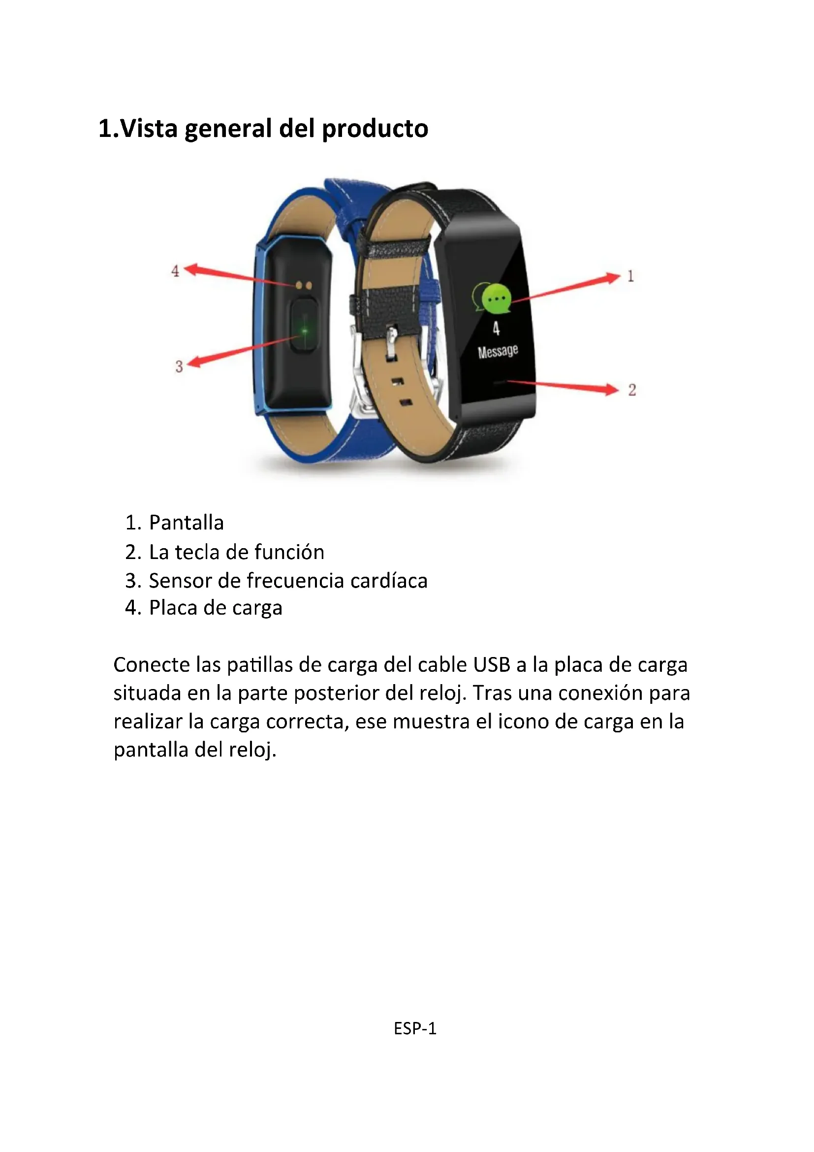 Conecte las patillas de carga del cable USB a la placa de carga situada en la parte posterior del reloj. Tras una conexión para realizar la carga correcta, ese muestra el icono de carga en la pantalla del reloj.ESP-2