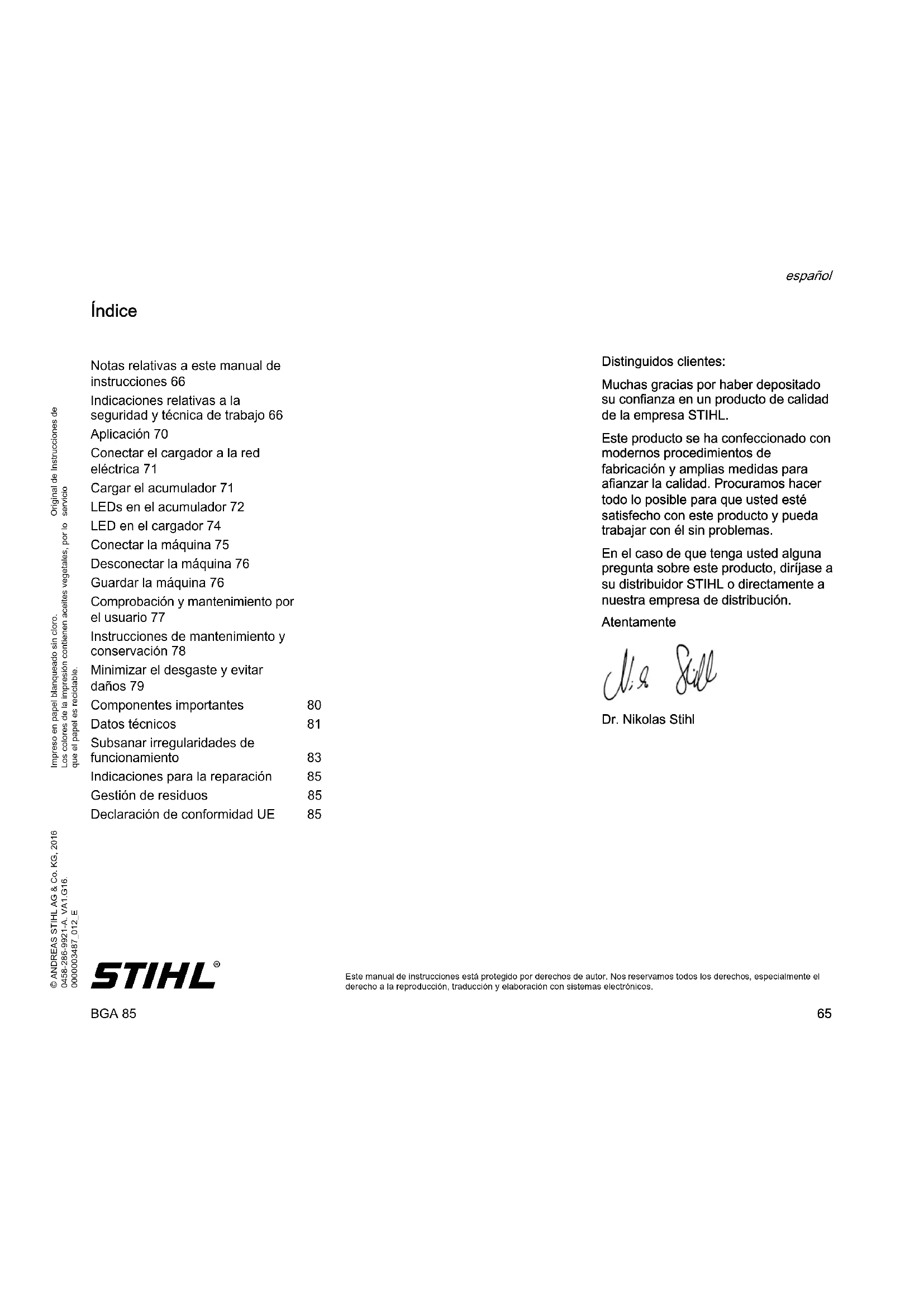 Este manual de instrucciones está protegido por derechos de autor. Nos reservamos todos los derechos, especialmente el derecho a la reproducción, traducción y elaboración con sistemas electrónicos. Índice Distinguidos clientes: Muchas gracias por haber depositado su confianza en un producto de calidad de la empresa STIHL. Este producto se ha confeccionado con modernos procedimientos de fabricación y amplias medidas para afianzar la calidad. Procuramos hacer todo lo posible para que usted esté satisfecho con este producto y pueda trabajar con él sin problemas. En el caso de que tenga usted alguna pregunta sobre este producto, diríjase a su distribuidor STIHL o directamente a nuestra empresa de distribución. Atentamente Dr. Nikolas Stihl Notas relativas a este manual de instrucciones 66 Indicaciones relativas a la seguridad y técnica de trabajo 66 Aplicación 70 Conectar el cargador a la red eléctrica 71 Cargar el acumulador 71 LEDs en el acumulador 72 LED en el cargador 74 Conectar la máquina 75 Desconectar la máquina 76 Guardar la máquina 76 Comprobación y mantenimiento por el usuario 77 Instrucciones de mantenimiento y conservación 78 Minimizar el desgaste y evitar daños 79 Componentes importantes 80 Datos técnicos 81 Subsanar irregularidades de funcionamiento 83 Indicaciones para la reparación 85 Gestión de residuos 85 Declaración de conformidad UE 85BGA 85 español