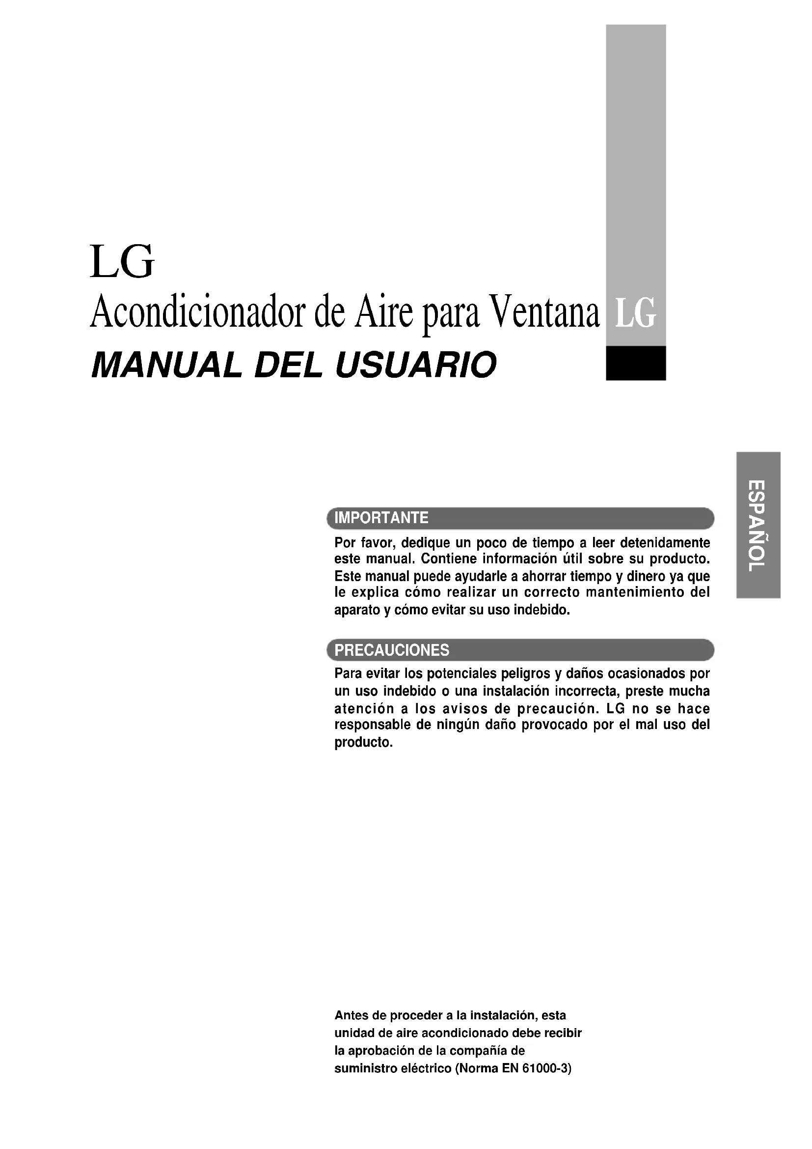 IMPORTANTE Por favor, dedique un poco de tiempo a leer detenidamenteeste manual. Contiene información útil sobre su producto.Este manual puede ayudarle a ahorrar tiempo y dinero ya quele explica cómo realizar un correcto mantenimiento delaparato y cómo evitar su uso indebido. PRECAUCIONES Para evitar los potenciales peligros y daños ocasionados porun uso indebido o una instalación incorrecta, preste muchaatención a los avisos de precaución. LG no se haceresponsable de ningún daño provocado por el mal uso delproducto.Antes de proceder a la instalación, estaunidad de aire acondicionado debe recibirla aprobación de la compañía desuministro eléctrico (Norma EN 61000-3)P ara sus archivos L ea este manual PRECAUCIÓN