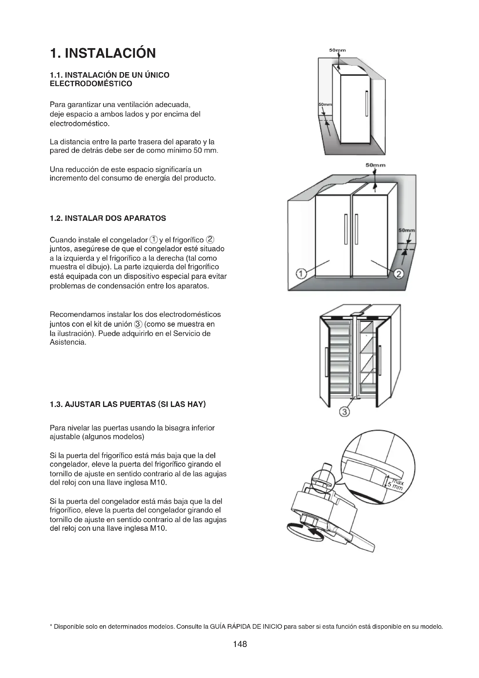 (comosemuestraen lailustración).PuedeadquirirloenelServiciode Asistencia. 1.3. AJUSTAR LAS PUERTAS (SI LAS HAY) Paranivelarlaspuertasusandolabisagrainferior ajustable(algunosmodelos) Silapuertadelfrigoríficoestámásbajaqueladel congelador,elevelapuertadelfrigoríficogirandoel tornillo de ajuste en sentido contrario al de las agujas delrelojconunallaveinglesaM10. Silapuertadelcongeladorestámásbajaqueladel frigorífico,elevelapuertadelcongeladorgirandoel tornillo de ajuste en sentido contrario al de las agujas delrelojconunallaveinglesaM10. *Disponiblesoloendeterminadosmodelos.ConsultelaGUÍARÁPIDADEINICIOparasabersiestafunciónestádisponibleensumodelo. 50mm 50mm 5 mm max149