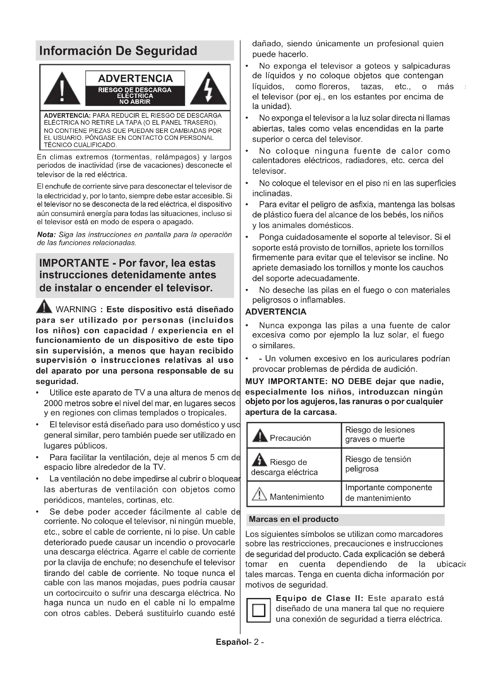- Información sobre su desecho Español- 2 - Información De Seguridad ADVERTENCIA RIESGO DE DESCARGA ELÉCTRICANO ABRIRADVERTENCIA: PARA REDUCIR EL RIESGO DE DESCARGA ELÉCTRICA NO RETIRE LA TAPA (O EL PANEL TRASERO). NO CONTIENE PIEZAS QUE PUEDAN SER CAMBIADAS POR EL USUARIO. PÓNGASE EN CONTACTO CON PERSONAL TÉCNICO CUALIFICADO.Nota: Siga las instrucciones en pantalla para la operación de las funciones relacionadas.En climas extremos (tormentas, relámpagos) y largos periodos de inactividad (irse de vacaciones) desconecte el televisor de la red eléctrica.El enchufe de corriente sirve para desconectar el televisor de la electricidad y, por lo tanto, siempre debe estar accesible. Si el televisor no se desconecta de la red eléctrica, el dispositivo aún consumirá energía para todas las situaciones, incluso si el televisor está en modo de espera o apagado. IMPORTANTE - Por favor, lea estas instrucciones detenidamente antes de instalar o encender el televisor. p. 38