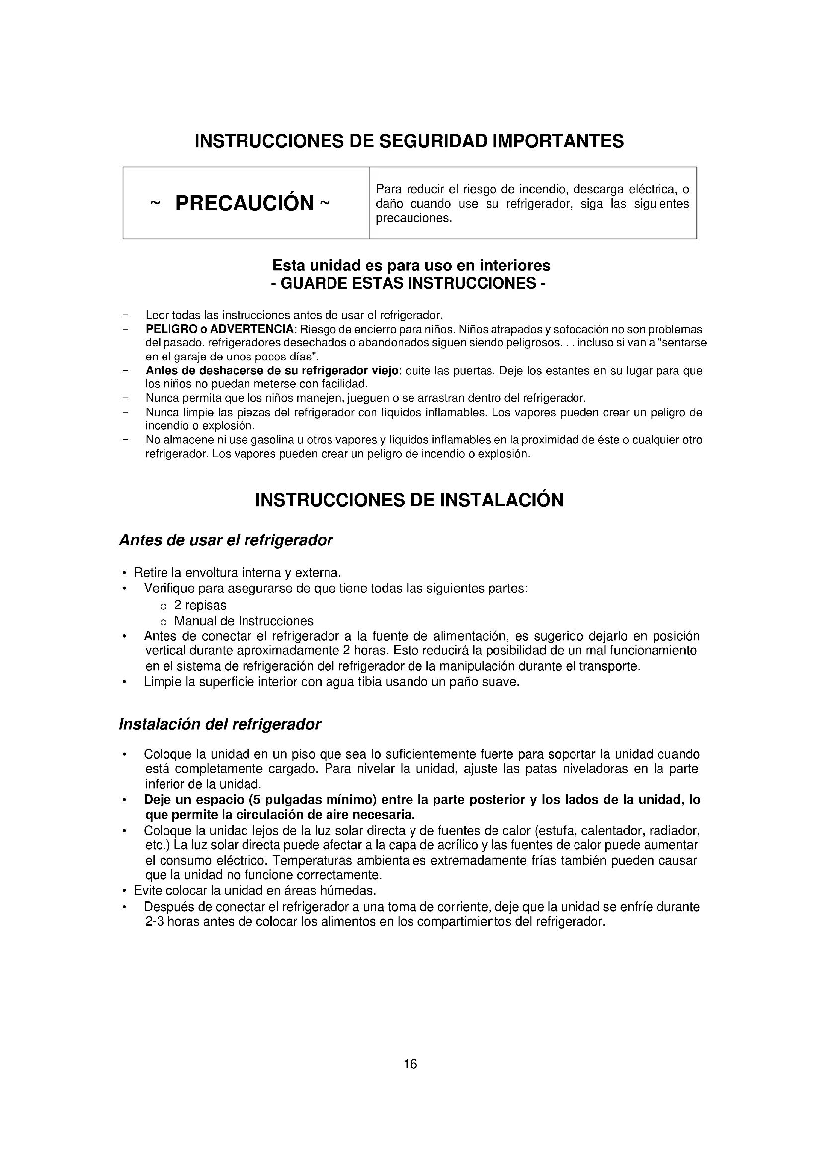 − Leer todas las instrucciones antes de usar el refrigerador. − PELIGRO o ADVERTENCIA: Riesgo de encierro para niños. Niños atrapados y sofocación no son problemas del pasado. refrigeradores desechados o abandonados siguen siendo peligrosos. . . incluso si van a "sentarse en el garaje de unos pocos días". − Antes de deshacerse de su refrigerador viejo: quite las puertas. Deje los estantes en su lugar para que los niños no puedan meterse con facilidad. − Nunca permita que los niños manejen, jueguen o se arrastran dentro del refrigerador. − Nunca limpie las piezas del refrigerador con líquidos inflamables. Los vapores pueden crear un peligro de incendio o explosión. − No almacene ni use gasolina u otros vapores y líquidos inflamables en la proximidad de éste o cualquier otro refrigerador. Los vapores pueden crear un peligro de incendio o explosión.
