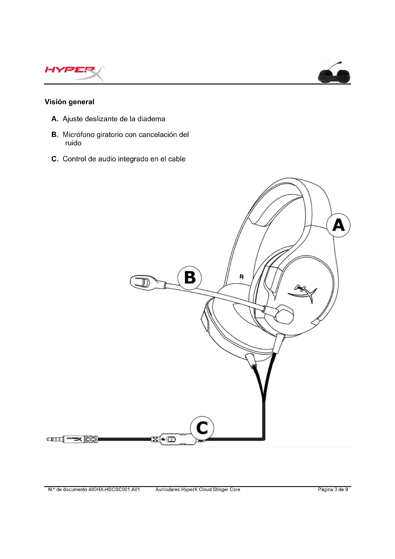 A. Ajuste deslizante de la diadema B. Micrófono giratorio con cancelación del ruido C. Control de audio integrado en el cableN.º de documento 480HX-HSCSC001.A01 Auriculares HyperX Cloud Stinger Core Página 4 de 9