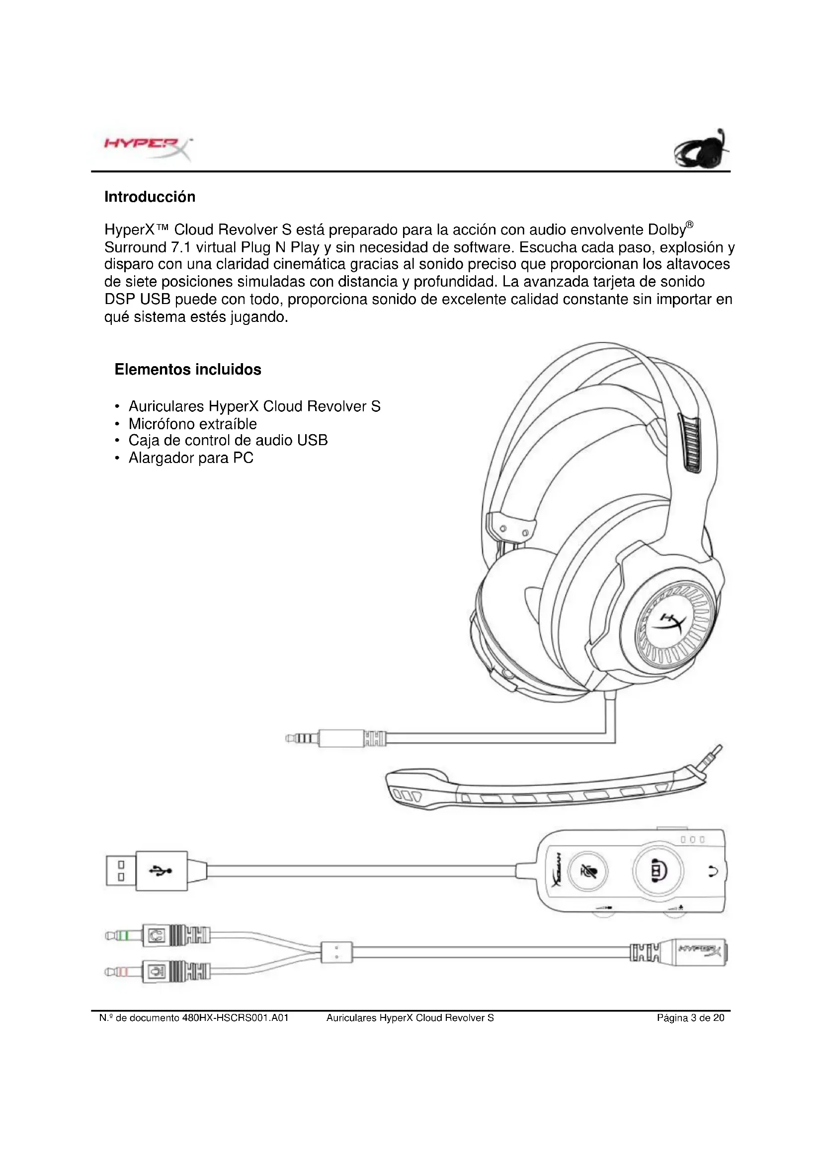 - Sensibilidad: -40 dBV (0 dB = 1 V/Pa, 1 kHz)N.º de documento 480HX-HSCRS001.A01 Auriculares HyperX Cloud Revolver S Página 5 de 20 Visión general A. Resistente estructura de acero B. Diadema en suspensión C. Micrófono extraíble con cancelación del ruido D. Cable incluido con clavija de 3,5 mm de 4 polos E. Caja de control de audio USB F. Alargador para PCN.º de documento 480HX-HSCRS001.A01 Auriculares HyperX Cloud Revolver S Página 6 de 20 Funcionamiento de la caja de control de audio USB La caja de control de audio USB tiene las siguientes funciones: