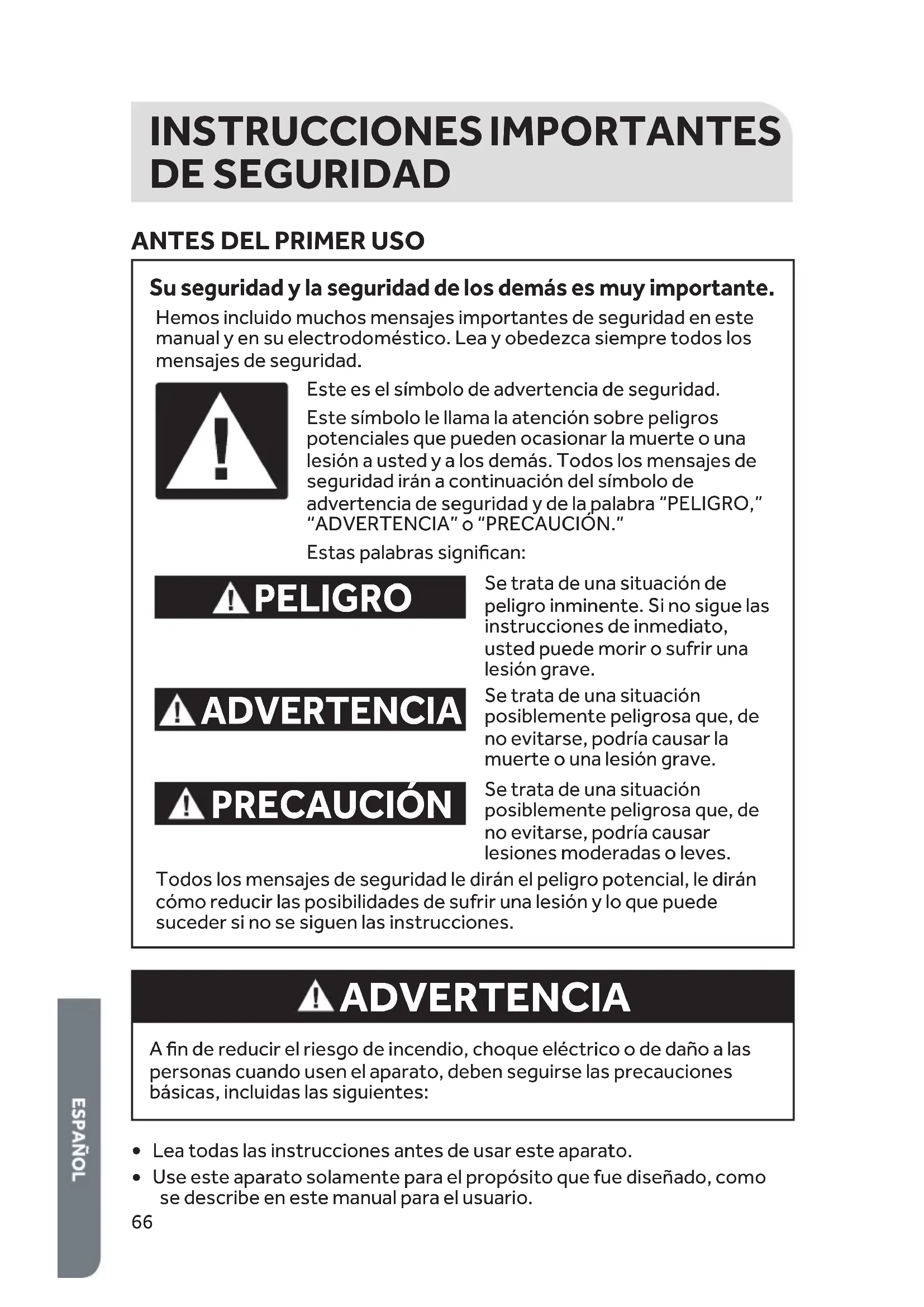 Su seguridad y la seguridad de los demás es muy importante. PELIGRO ADVERTENCIA PRECAUCIÓN Este es el símbolo de advertencia de seguridad.Este símbolo le llama la atención sobre peligros potenciales que pueden ocasionar la muerte o una lesión a usted y a los demás. Todos los mensajes de seguridad irán a continuación del símbolo de advertencia de seguridad y de la palabra “PELIGRO,” “ADVERTENCIA” o “PRECAUCIÓN.”Estas palabras significan:Se trata de una situación de peligro inminente. Si no sigue las instrucciones de inmediato, usted puede morir o sufrir una lesión grave.Se trata de una situación posiblemente peligrosa que, de no evitarse, podría causar la muerte o una lesión grave.Se trata de una situación posiblemente peligrosa que, de no evitarse, podría causar lesiones moderadas o leves.Todos los mensajes de seguridad le dirán el peligro potencial, le dirán cómo reducir las posibilidades de sufrir una lesión y lo que puede suceder si no se siguen las instrucciones.Hemos incluido muchos mensajes importantes de seguridad en este manual y en su electrodoméstico. Lea y obedezca siempre todos los mensajes de seguridad. ADVERTENCIA A fin de reducir el riesgo de incendio, choque eléctrico o de daño a las personas cuando usen el aparato, deben seguirse las precauciones básicas, incluidas las siguientes: