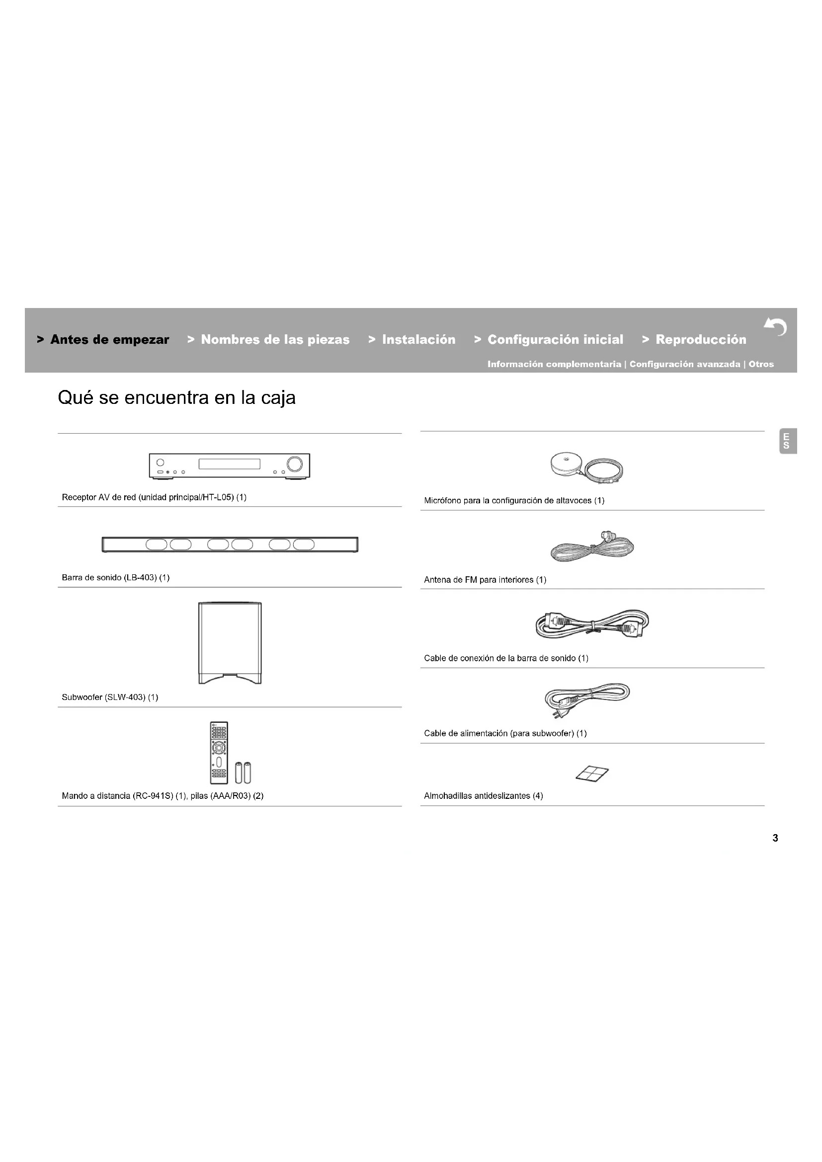 Qué se encuentra en la caja Receptor AV de red (unidad principal/HT-L05) (1) Barra de sonido (LB-403) (1) Subwoofer (SLW-403) (1) Mando a distancia (RC-941S) (1), pilas (AAA/R03) (2) Micrófono para la configuración de altavoces (1) Antena de FM para interiores (1) Cable de conexión de la barra de sonido (1) Cable de alimentación (para subwoofer) (1) Almohadillas antideslizantes (4)4 > Antes de empezar > Nombres de las piezas > Instalación > Configuración inicial > Reproducción Información complementaria | Configuración avanzada | Otros