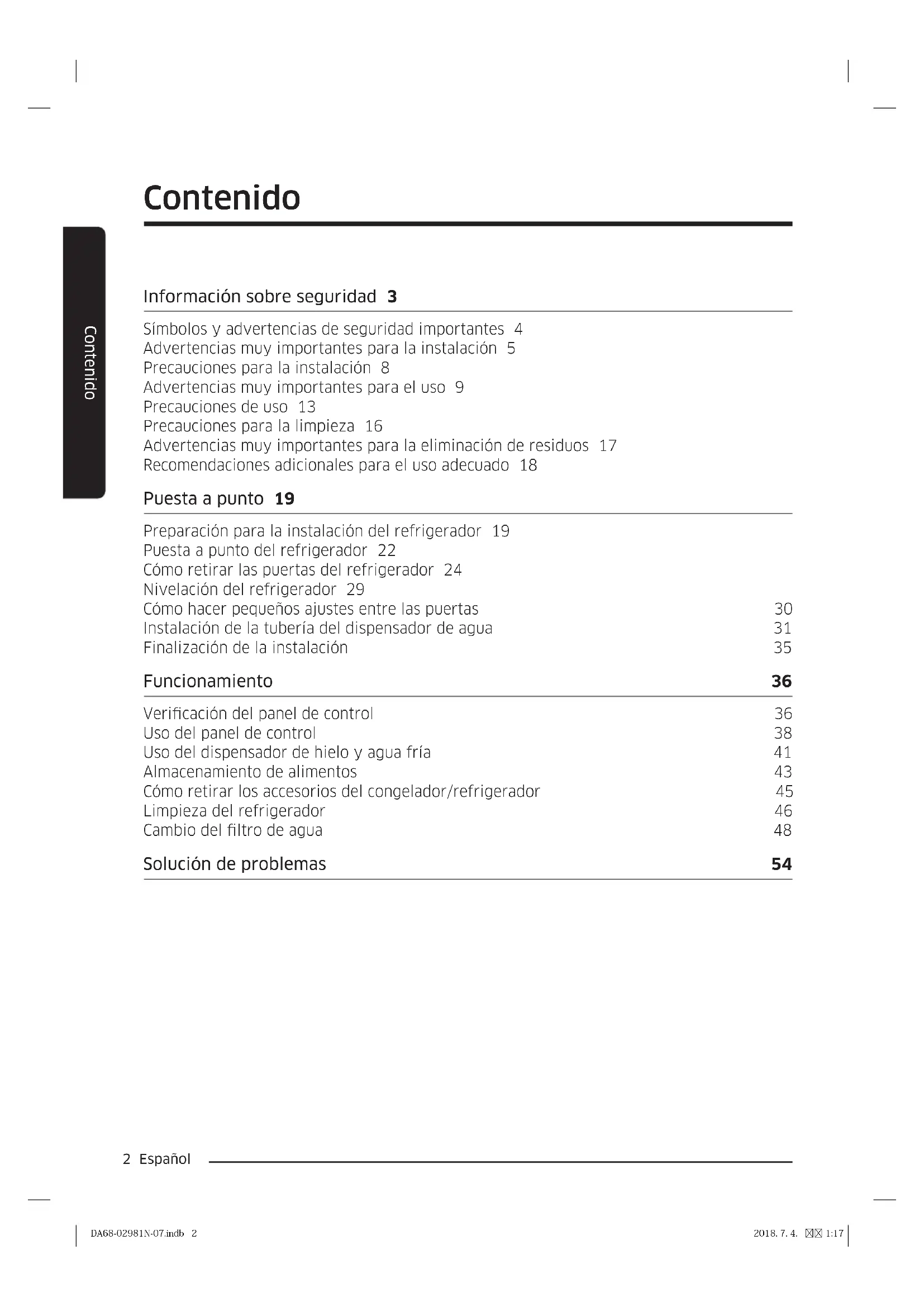 - Requires reader to be installed on your smartphone DA68-02981N-07.indb62 2018.7.4.1:17Refrigerador Manual del usuario RS25J50* Electrodoméstico independiente DA68-02981N-07.indb1 2018.7.4.1:172 Español Contenido Contenido Información sobre seguridad 3 Símbolos y advertencias de seguridad importantes 4 Advertencias muy importantes para la instalación 5 Precauciones para la instalación 8 Advertencias muy importantes para el uso 9 Precauciones de uso 13 Precauciones para la limpieza 16 Advertencias muy importantes para la eliminación de residuos 17 Recomendaciones adicionales para el uso adecuado 18 Puesta a punto 19 Preparación para la instalación del refrigerador 19 Puesta a punto del refrigerador 22 Cómo retirar las puertas del refrigerador 24 Nivelación del refrigerador 29 Cómo hacer pequeños ajustes entre las puertas 30 Instalación de la tubería del dispensador de agua 31 Finalización de la instalación 35 Funcionamiento 36 Vericación del panel de control 36 Uso del panel de control 38 Uso del dispensador de hielo y agua fría 41 Almacenamiento de alimentos 43 Cómo retirar los accesorios del congelador/refrigerador 45 Limpieza del refrigerador 46 Cambio del ltro de agua 48 Solución de problemas 54 DA68-02981N-07.indb2 2018.7.4.1:17Español 3 Información sobre seguridad Información sobre seguridad