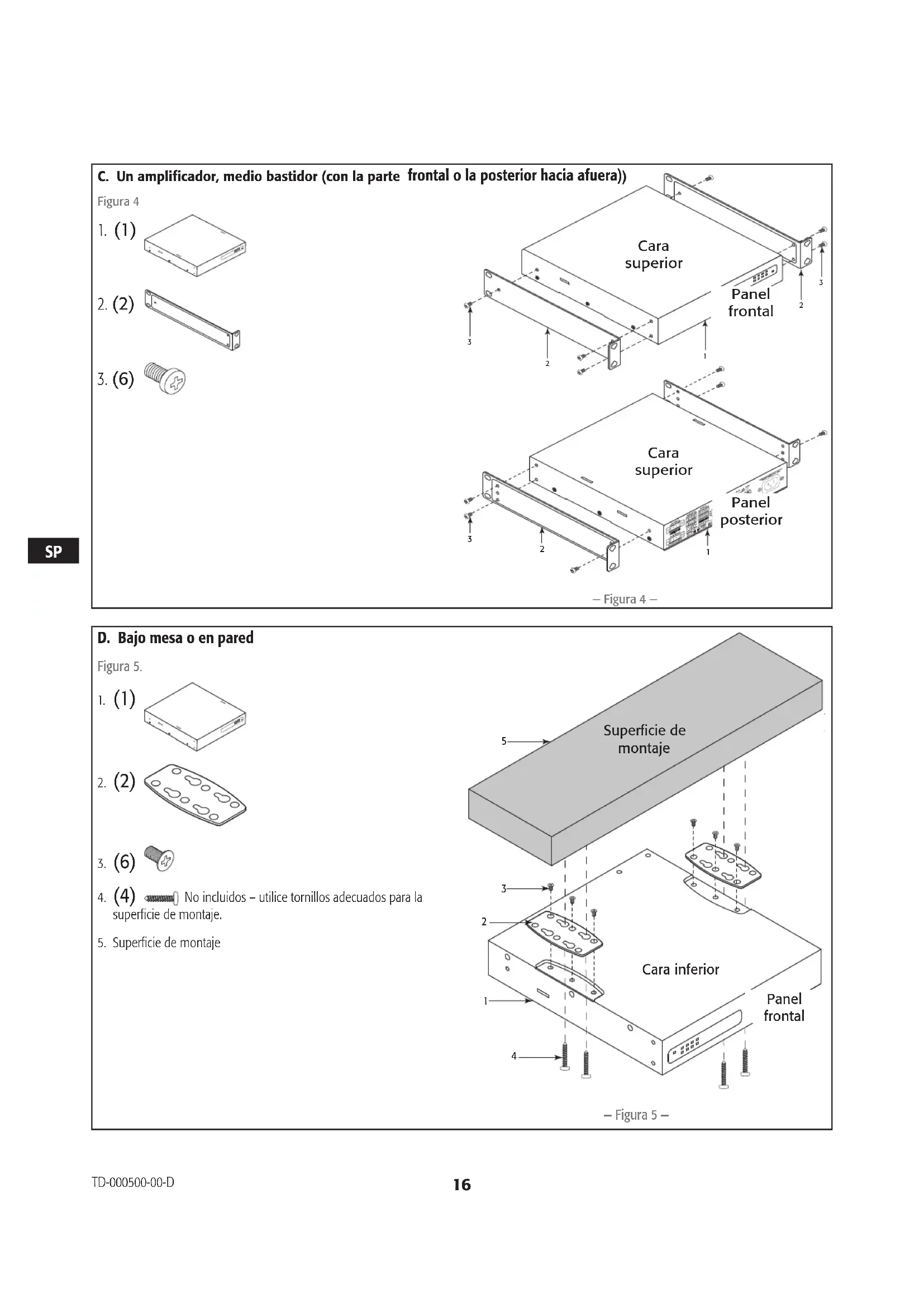 Seleccione la configuración de instalación del amplificador Escoja una de las opciones de configuración siguientes: A. Un amplificador en un bastidor (rack) de 48,3 cm (19 pulgadas) (montaje a derecha o izquierda) on page 15 D. Bajo mesa o en pared on page 16 B. Dos amplificadores en bastidor (rack) de 19 pulgadas (con la parte frontal o la posterior hacia afuera) on page 15 E. En sobremesa, sin bastidor on page 17 C. Un amplificador, medio bastidor (con la parte frontal o la posterior hacia afuera)) on page 16 F. Instalación de la bomba impelente de aire on page 1715 TD-000500-00-D